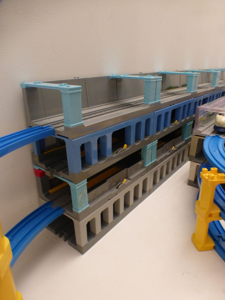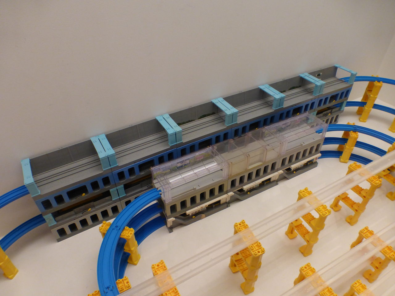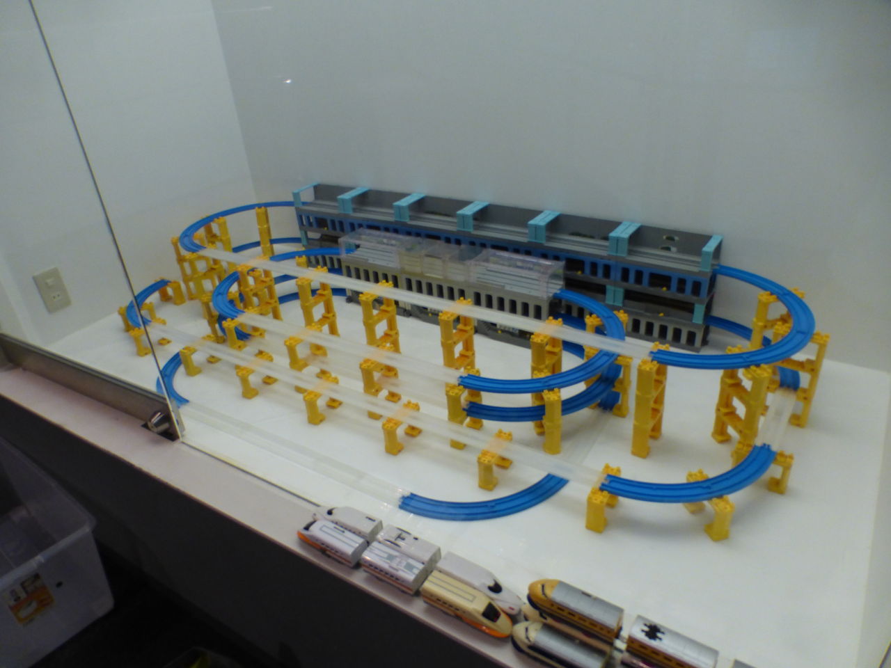 実際に車両が走るのは上2段と4段で駅や切りかけレールによる一直線の構造。地下駅や地下レールはここではレイアウトを華やかにするために飾りの役割として使っています。