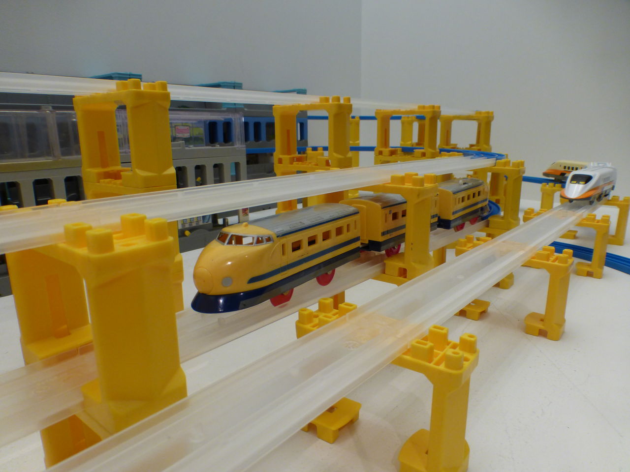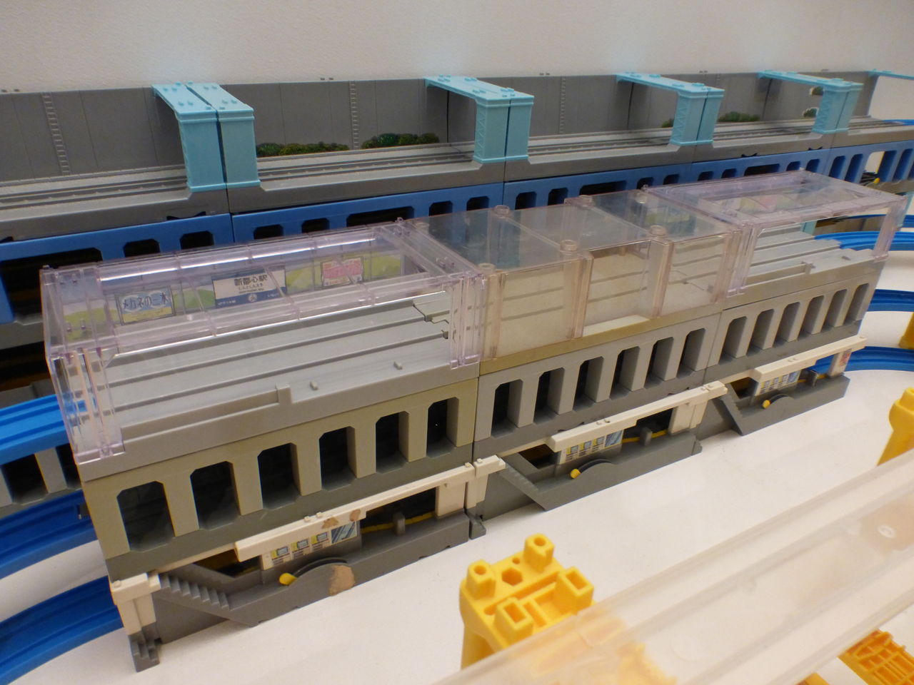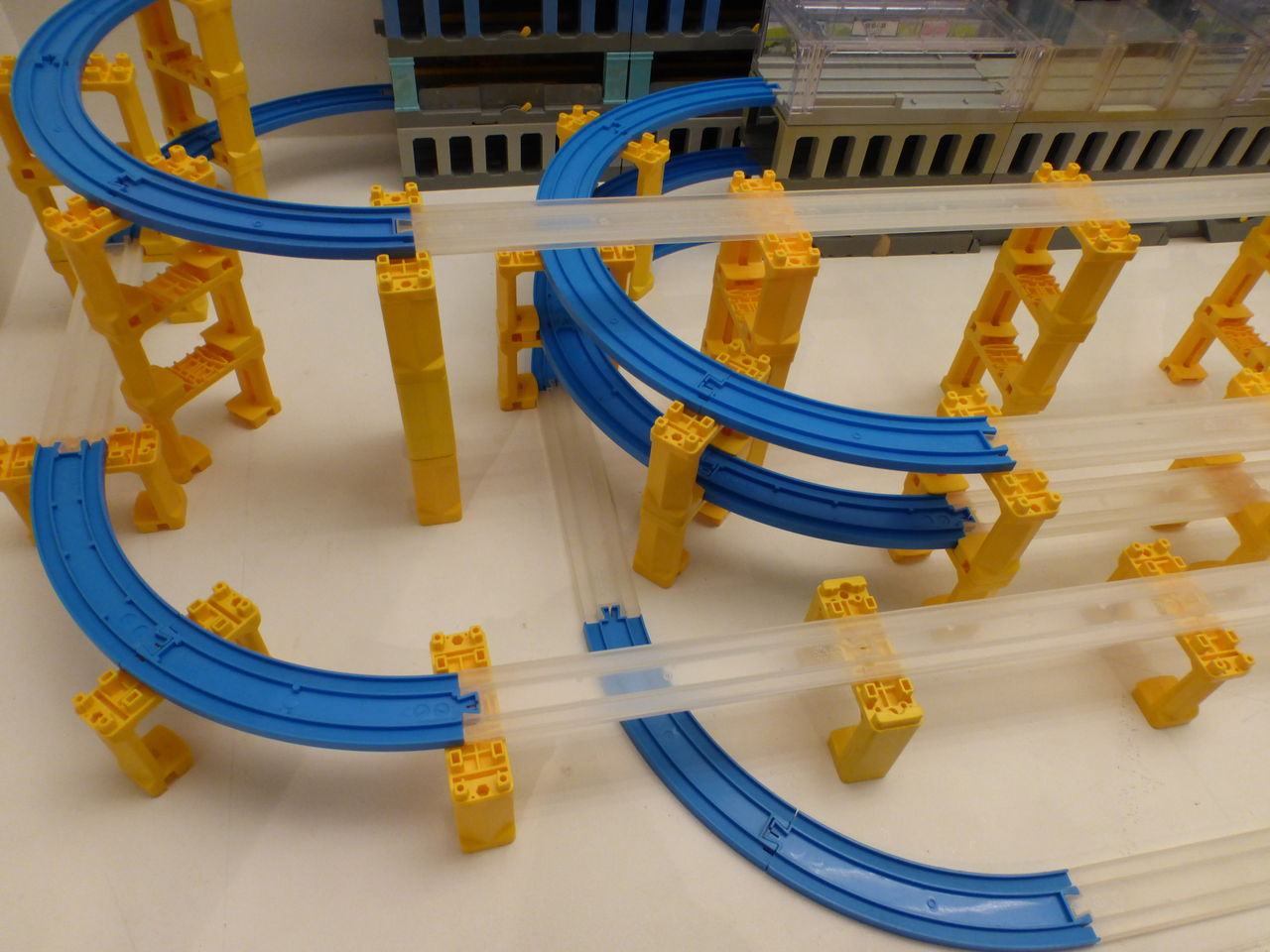 手前は線路同士が多く立体交差しています。直線線路はすべて透明色のもので統一したので下が透けて見える構造に。
