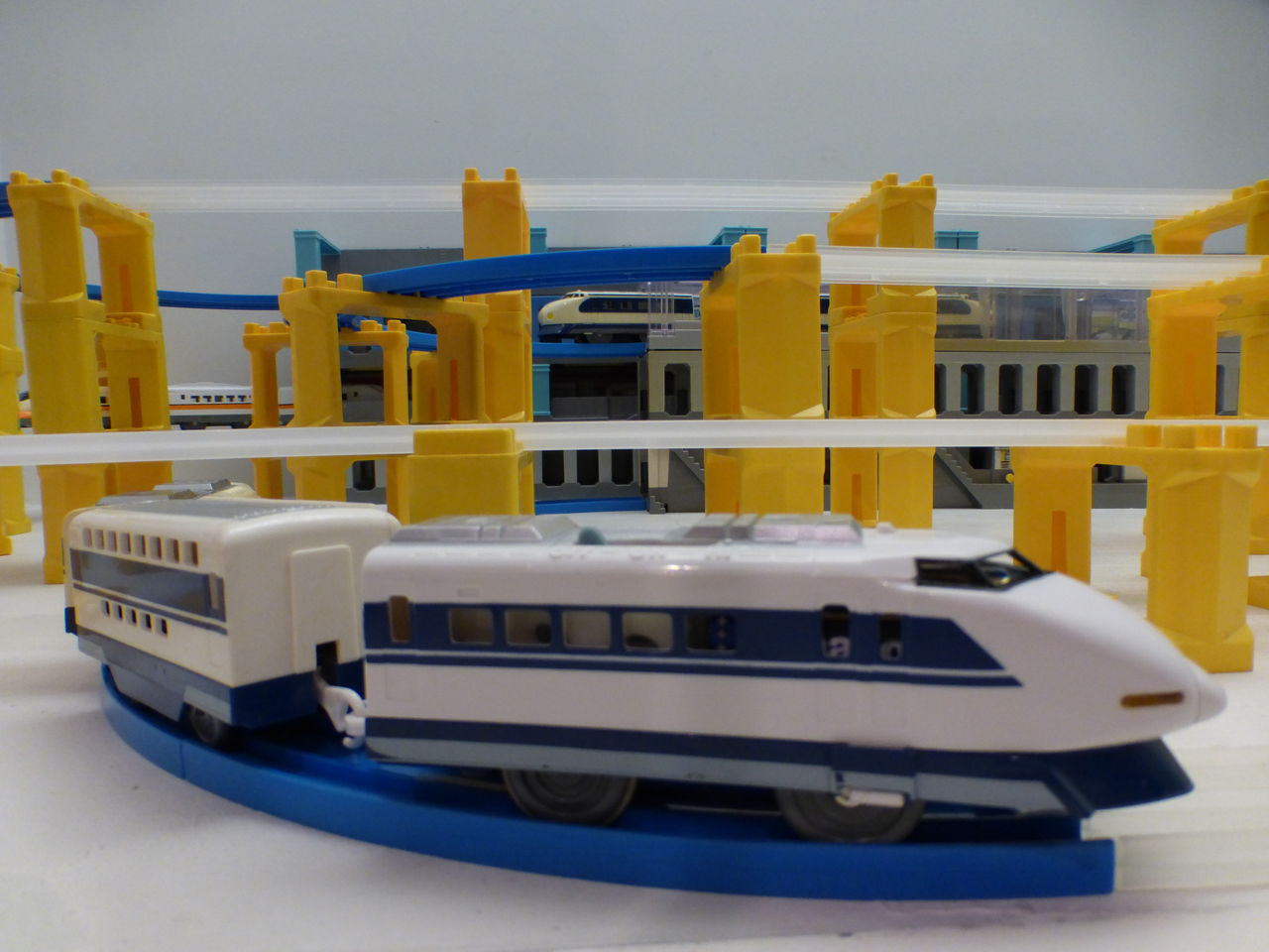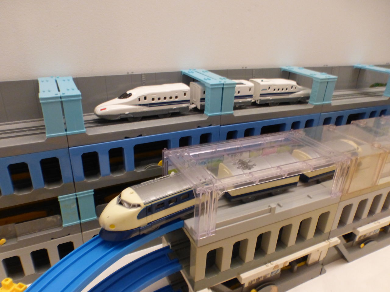 基本的な構成は楕円形の線とを上下に並べた形になります。どの線路にも坂レールによる上り下りはなく、一つの階層で完結するようになっています。手前から奥に行くにつれて段数が高くなっているのが特徴。