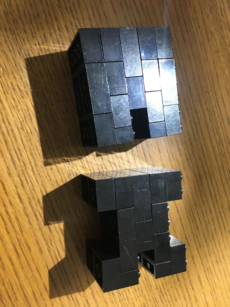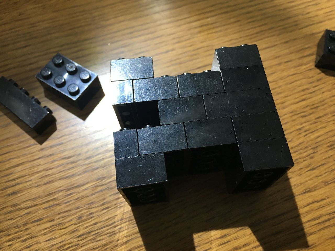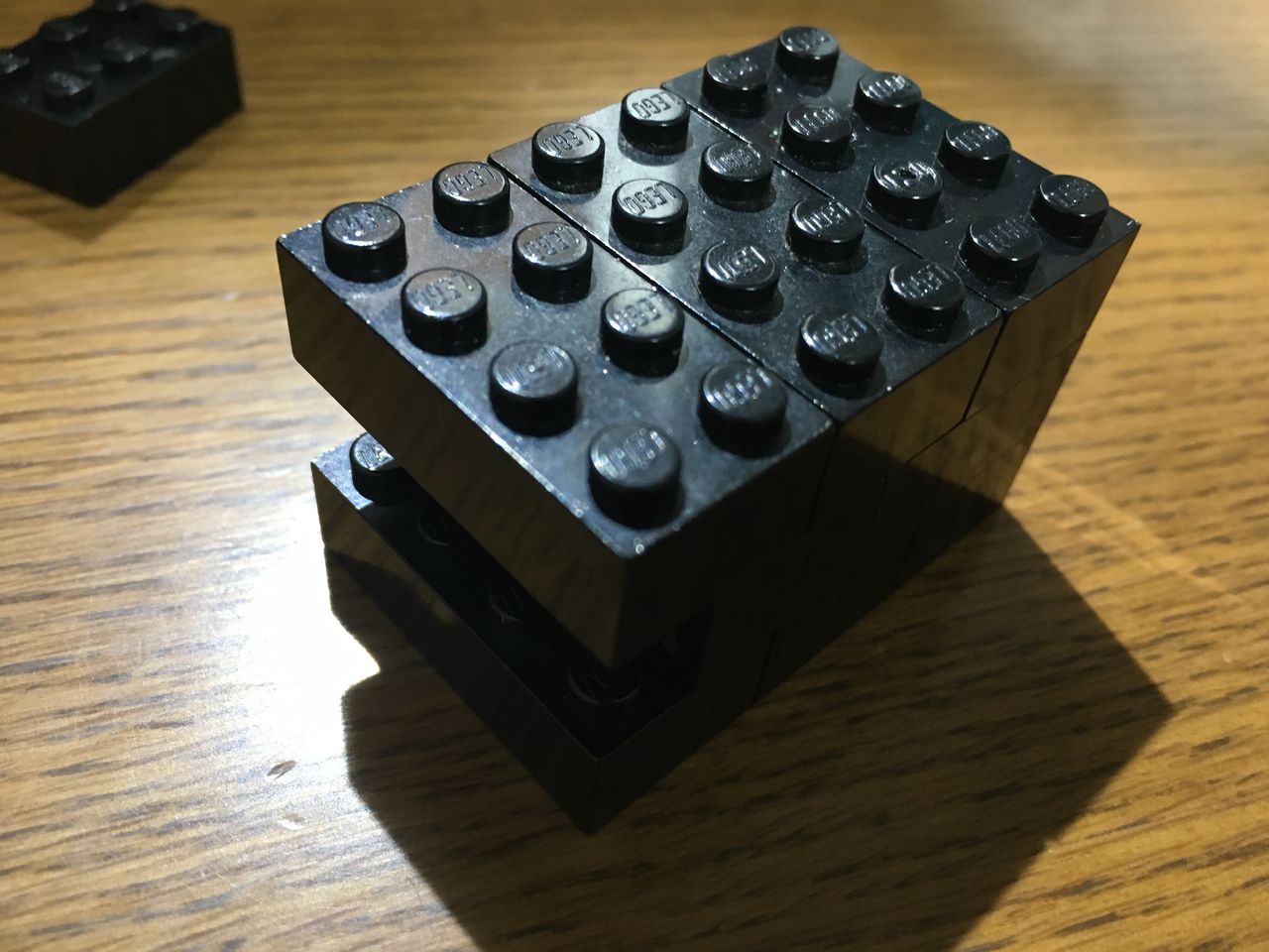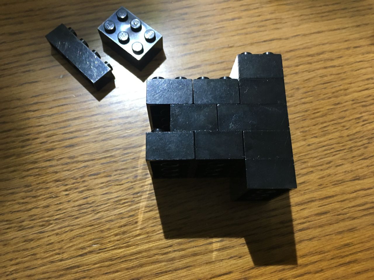 そして穴の開いていない方の上下に4×2ブロックをかみ合わせ,もう一方で上の2枚目の写真のように1×4と2×4のブロックをL字に組み合わせたものをはめ込みます.