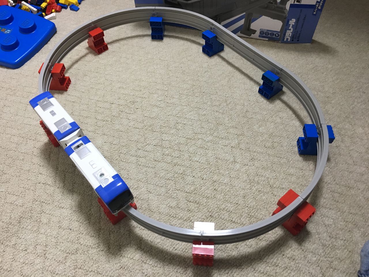 そして,レゴ橋脚の上にレールを置いて見ました.これが結構安定していて,快適に走ってくれます.ちゃんとカーブでもしっかりとはまってくれるのも嬉しいところです.