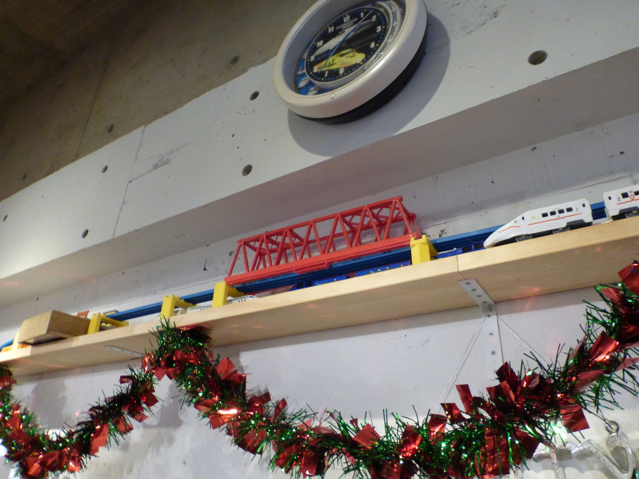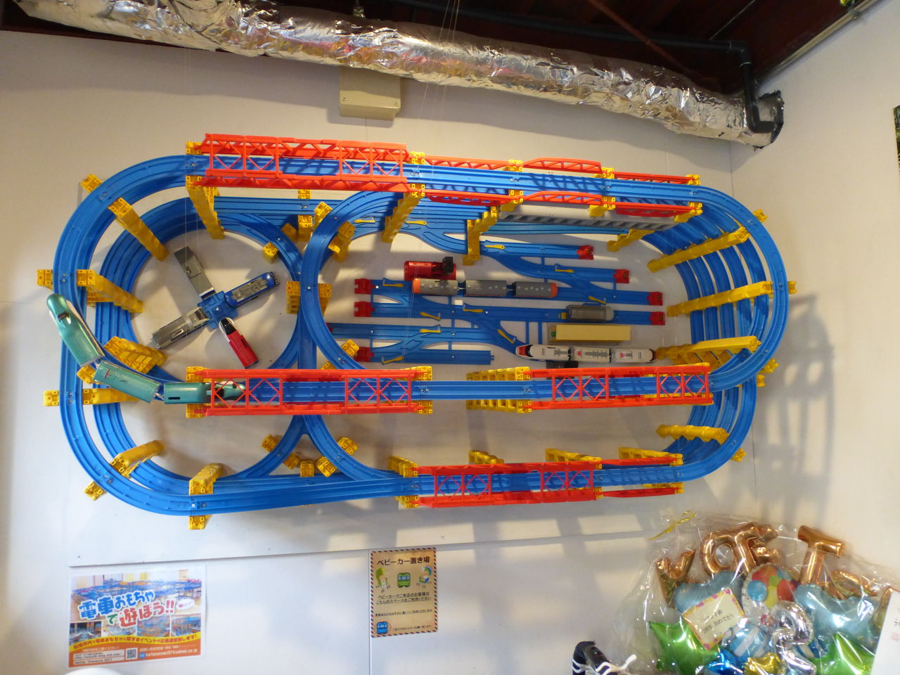 外の玄関口で順番を待っていることにしましょう。そこにはなんと垂直に立てかけられたプラレールのレイアウトが!この発想には脱帽…!ちなみに糸で吊ってあるみたいです。
