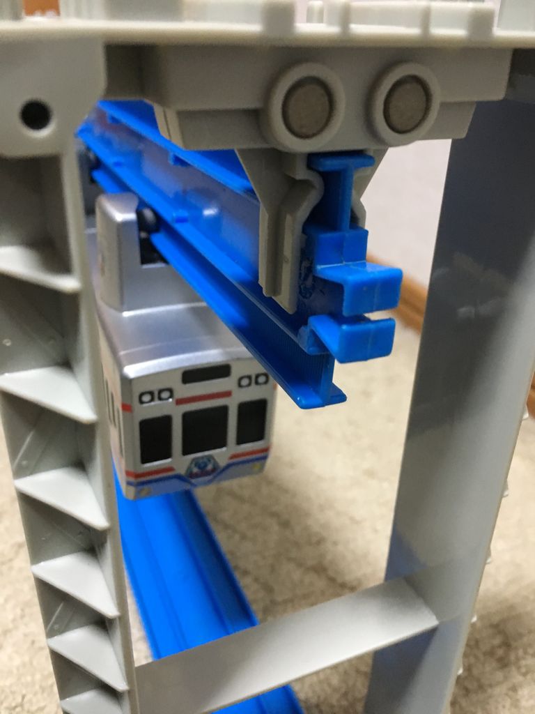 貴重なレールの部類に入りますが、持っていて絶対に役に立ちます。なによりも巨大立体レイアウトが安定する上、レールを縦にして懸垂式モノレールを走らせることができます。というかそもそもモノレールを走らせるものですこれ。