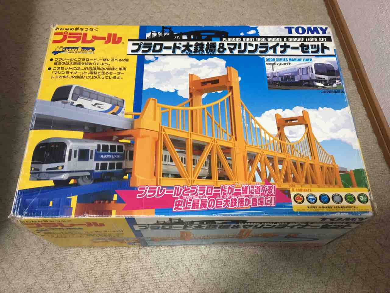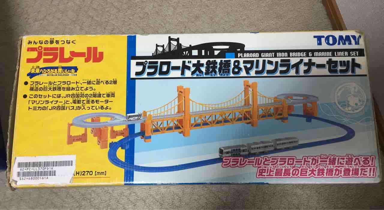 写真中の箱に写っている製品がそうで、本物の瀬戸大橋と同じように上にプラロード、下にレールを通せる構造になっていて、2層で列車やモータートミカを走らせられる情景部品です。FullSizeRender