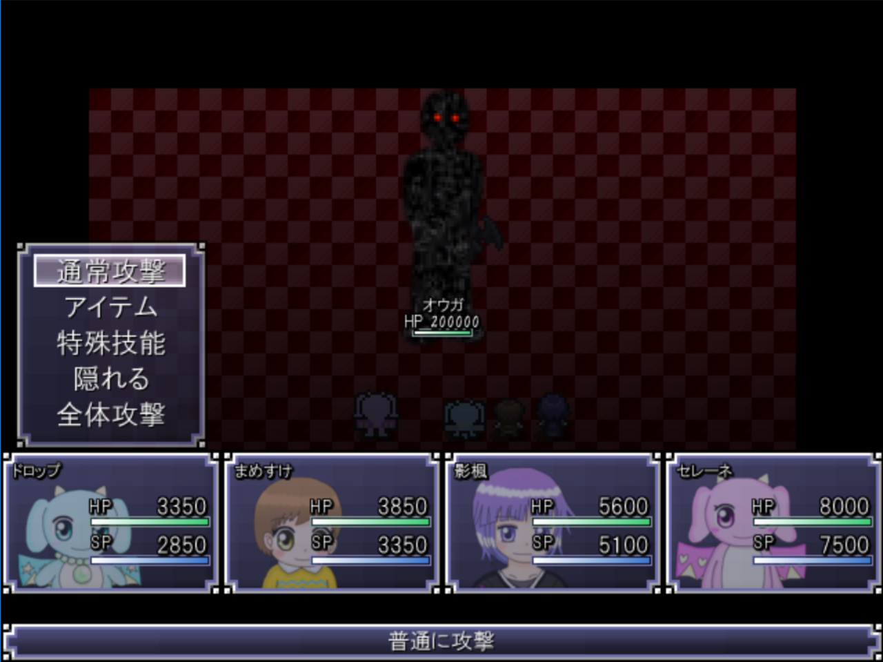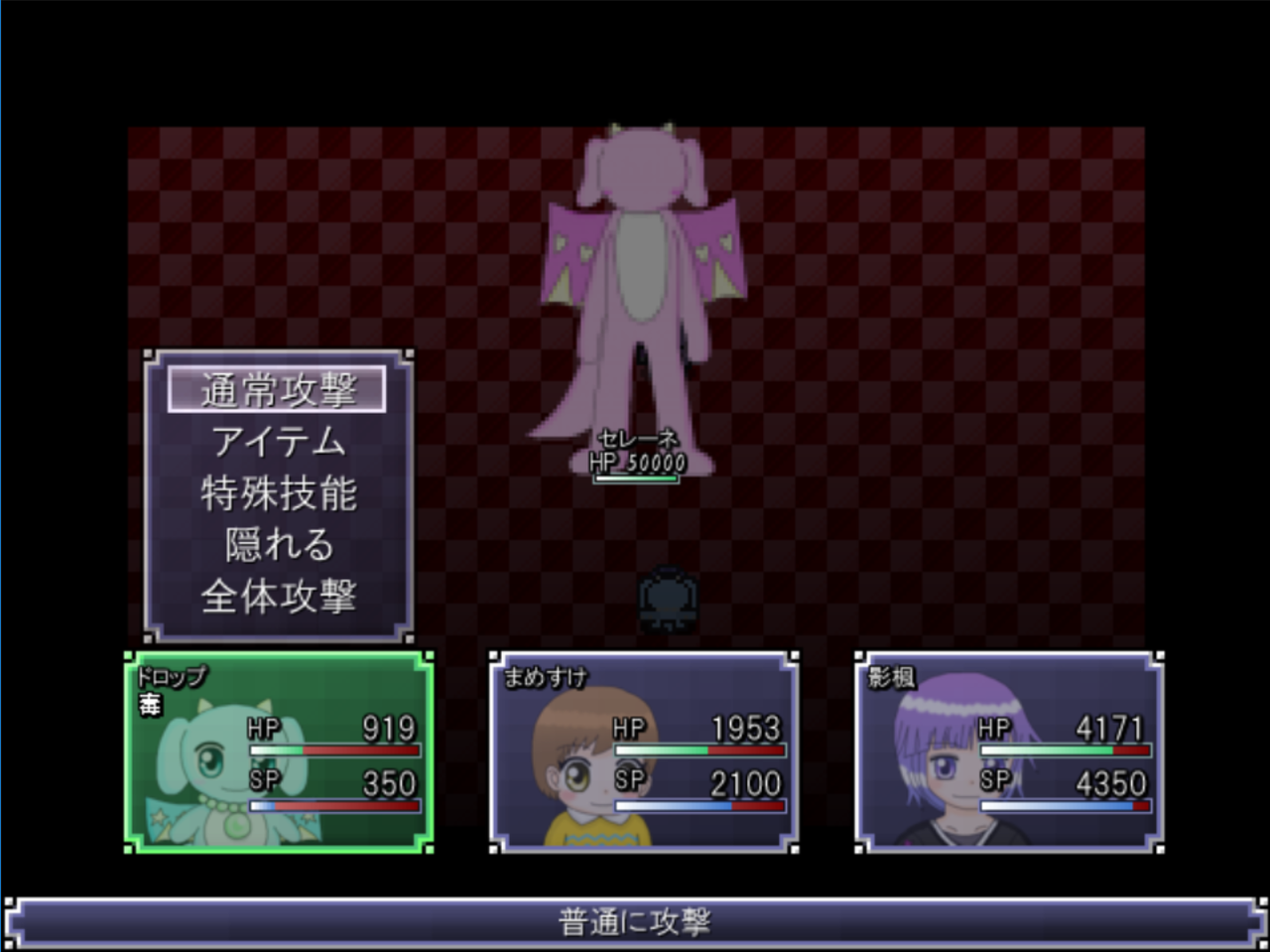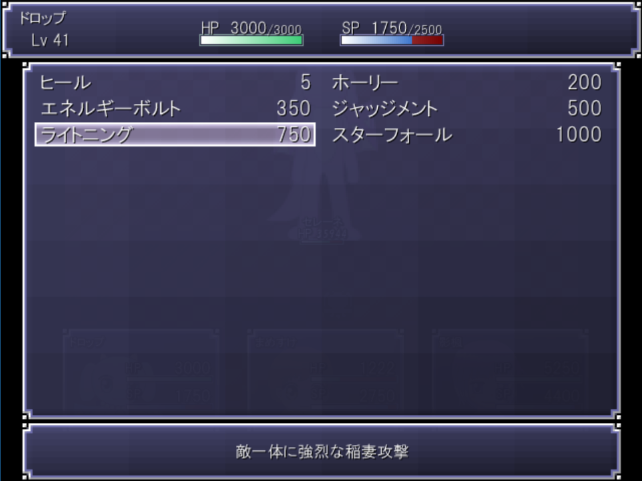 基本的な攻撃方針はセレーネは稲妻攻撃に弱いので、ドロップのライトニング(稲妻攻撃)で相手の体力を削っていくことになります。なお、稲妻攻撃はドロップのこれ一つのみ。なので、まめすけくん、影楓はドロップを特殊技能やアイテムでSPやHPをひたすらに回復させることに努めます。攻撃はドロップに体力があるうちに行いましょう。