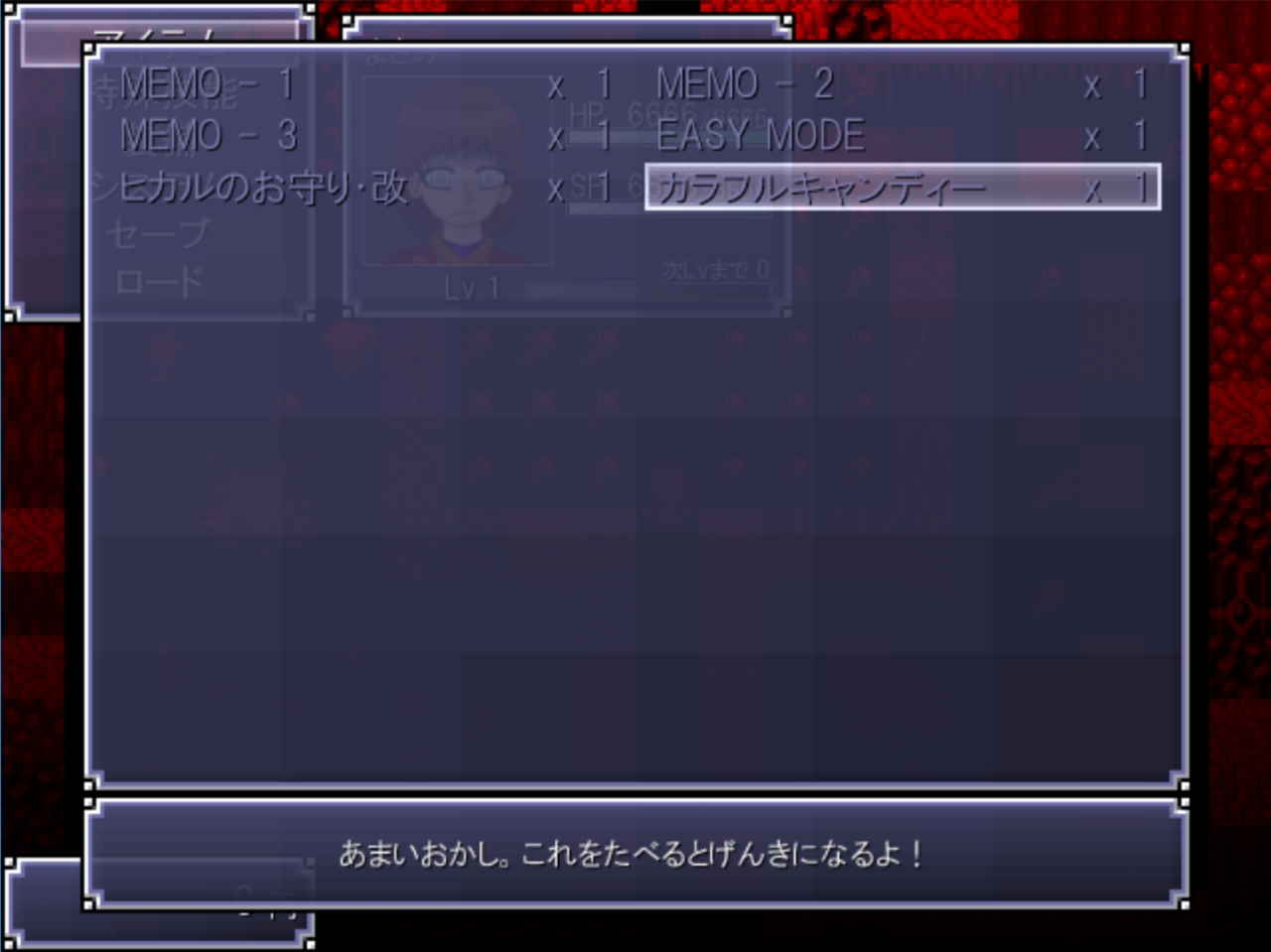 ちなみにキャンディーの説明文がこれ。「あまいおかし。これをたべるとげんきになるよ!」。確かに元気にはなりそうです。