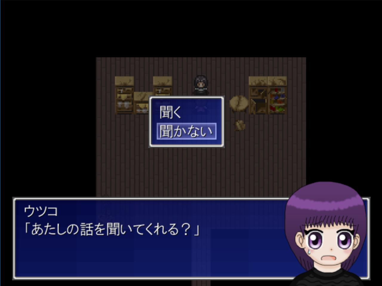 このウツコエンドはゆみパートでウツコと会話するときに上の画面で「聞かない」を選ぶと発生します。また、ここで「聞く」を選んでも後の選択のしようによってはウツコエンドが発生します。