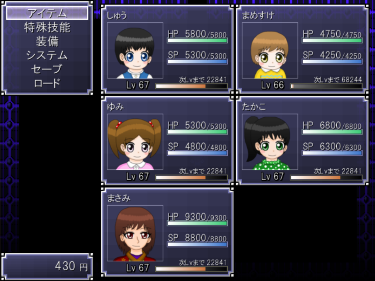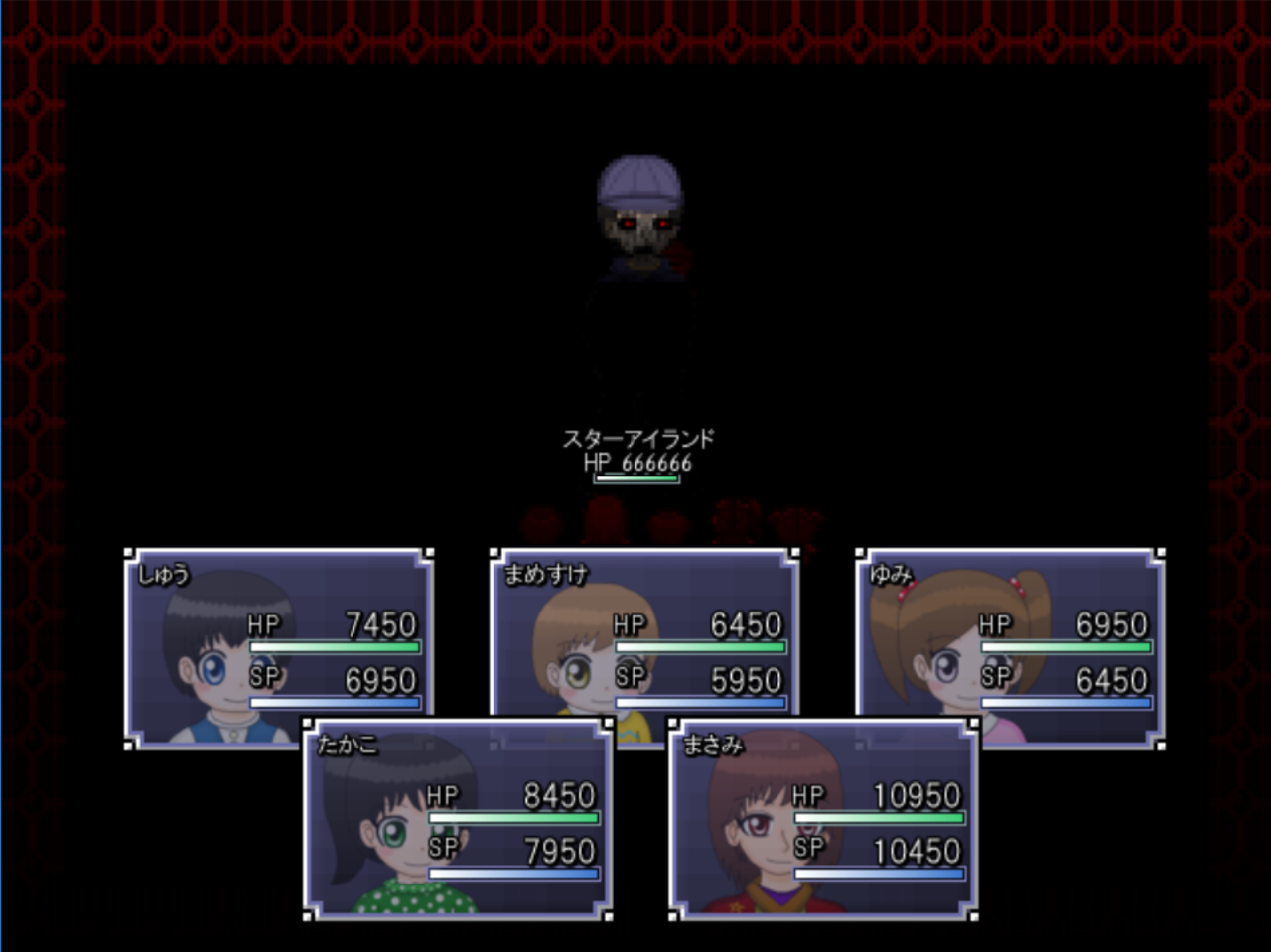 実はある事情でラスボスであるスタアイさんと対峙するときに、正規ルートよりも弱くステータスが設定されるのです。どうにもまめすけくんのRPG編が終わった時のレベルにみんなが合わせるみたいです。(正規ルートのスタアイ戦ではメンバー全員がレベル100になる)