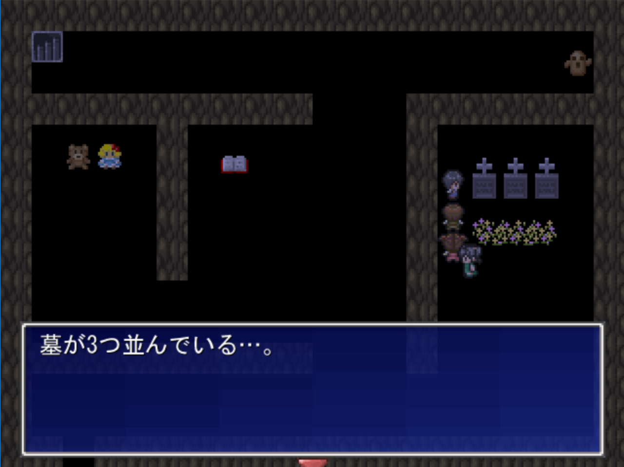 屋敷に入ると墓が3つ並んでいます。暗いし壁がめっちゃ土色。さらに意味深な本とお人形、そして埴輪も。やっぱ変に屋敷など言い張らずに洞窟で良かったんじゃぁないすかねぇ…。