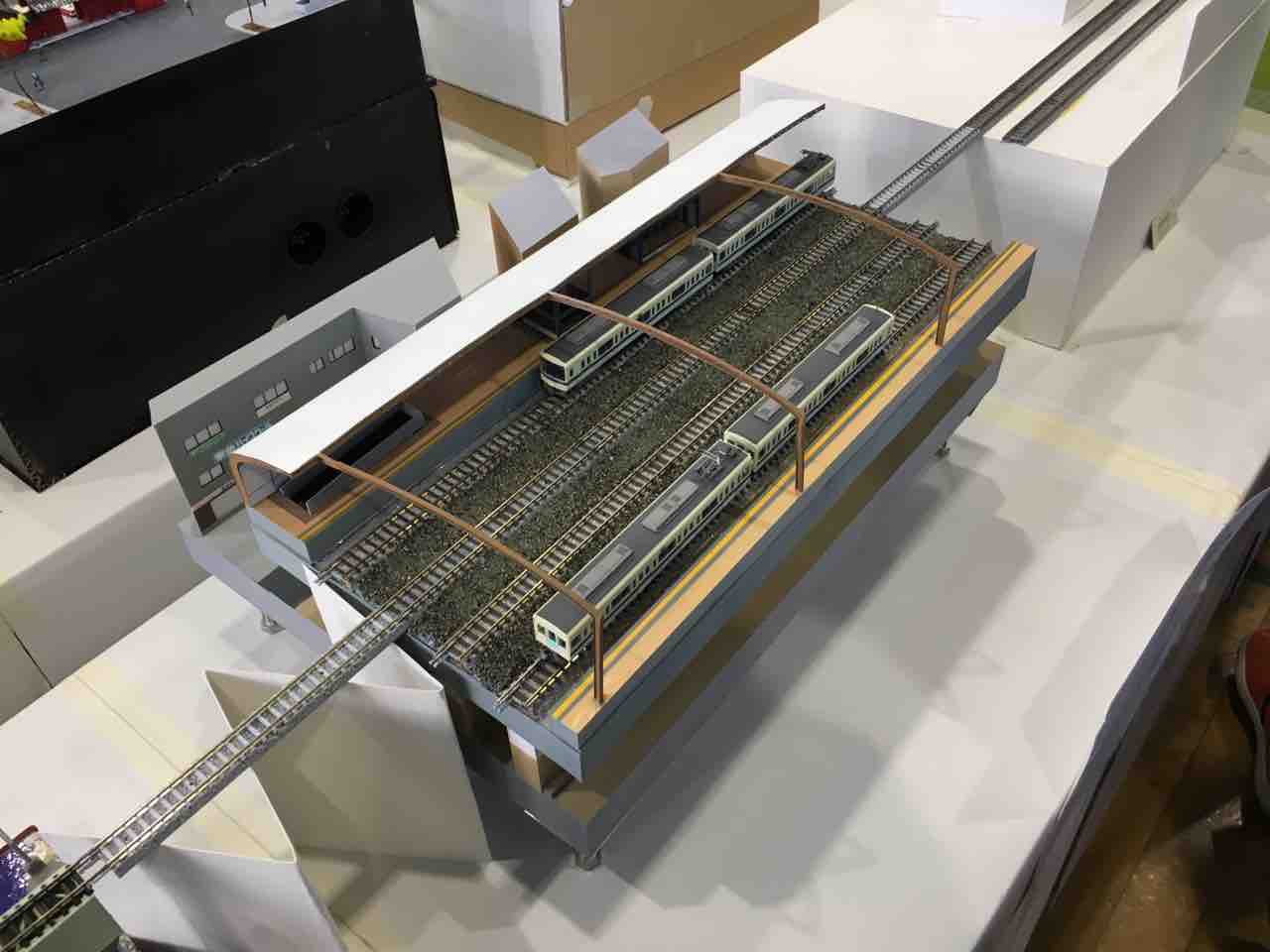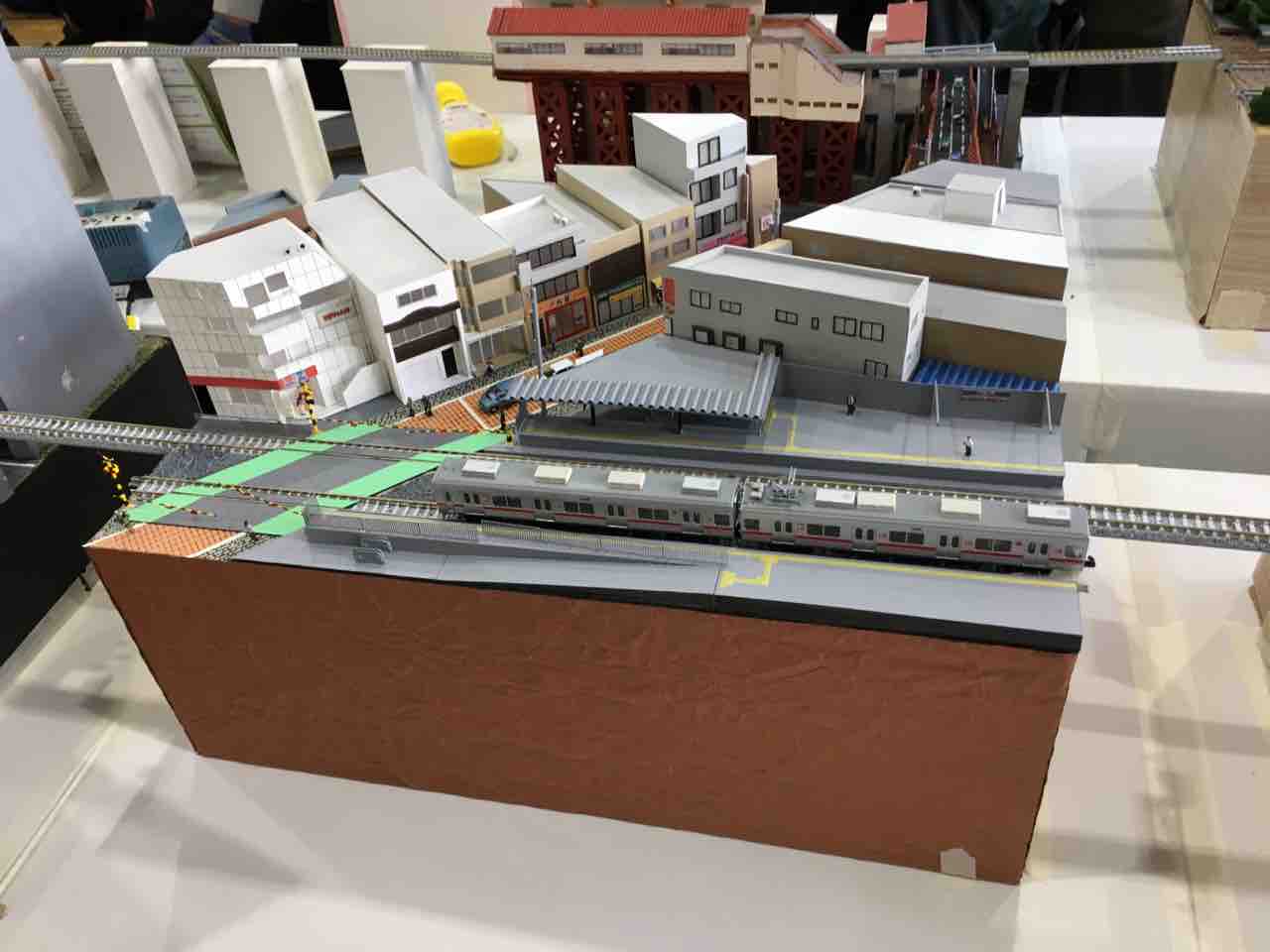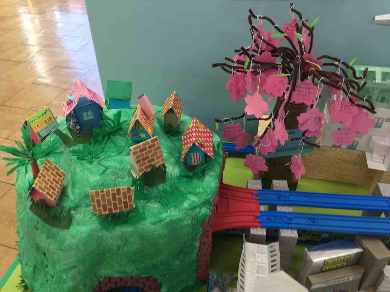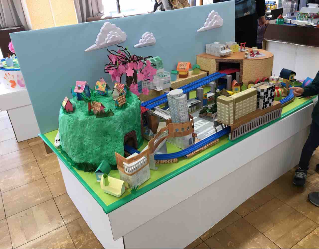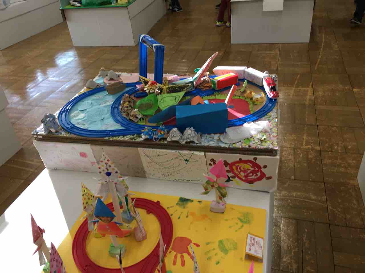 まずはプラレールのペーパージオラマから。プラレールだけあって可愛らしい、おもちゃ箱のようなジオラマが展示されていました。