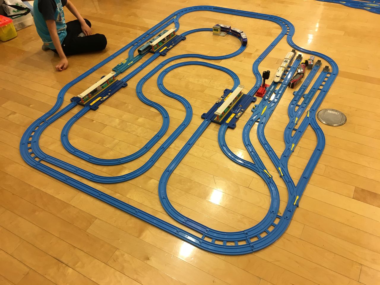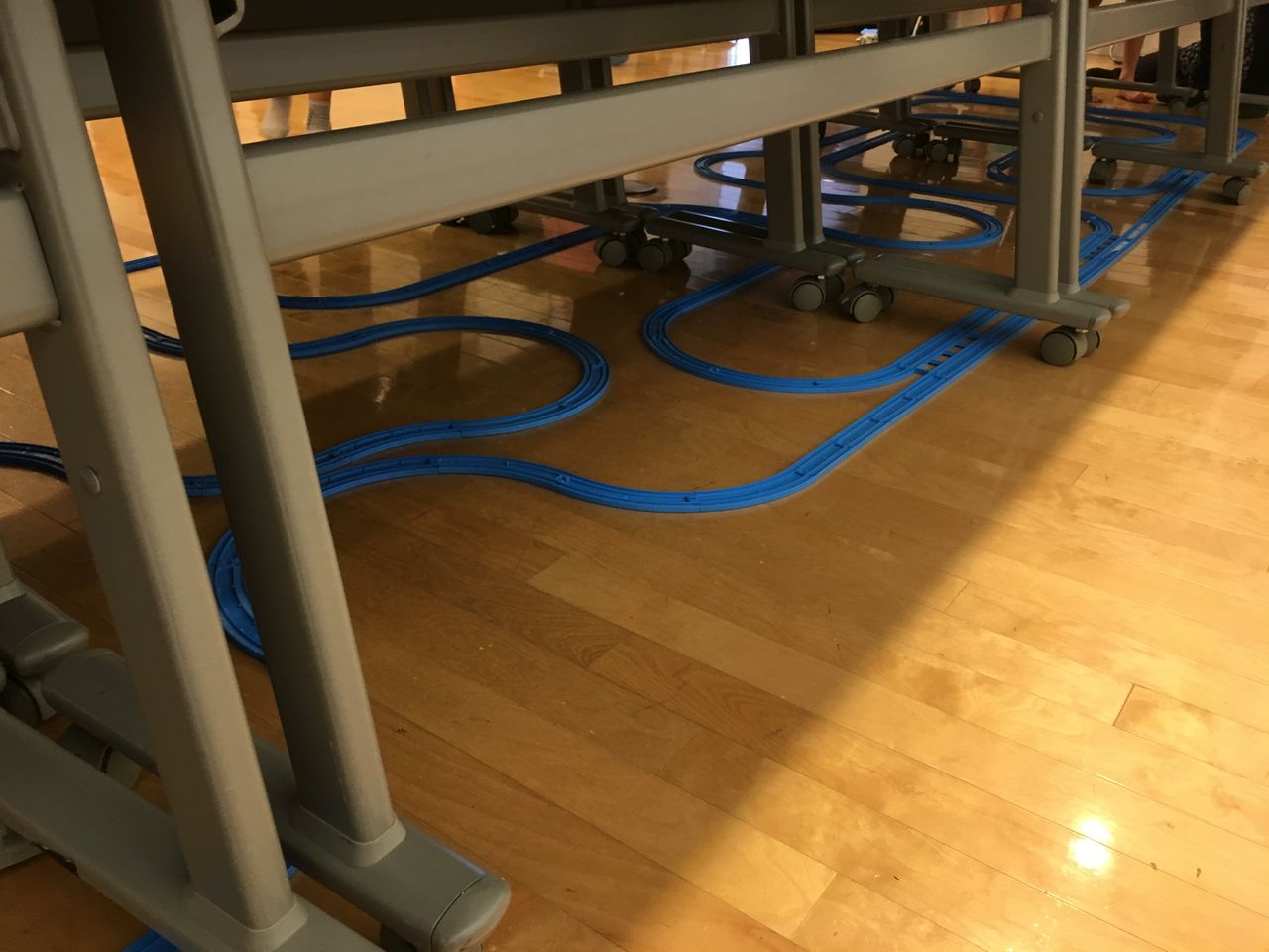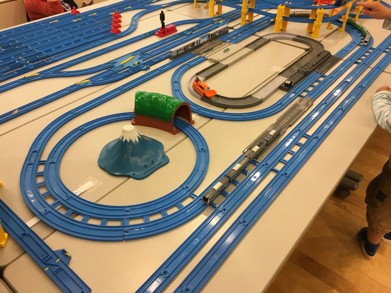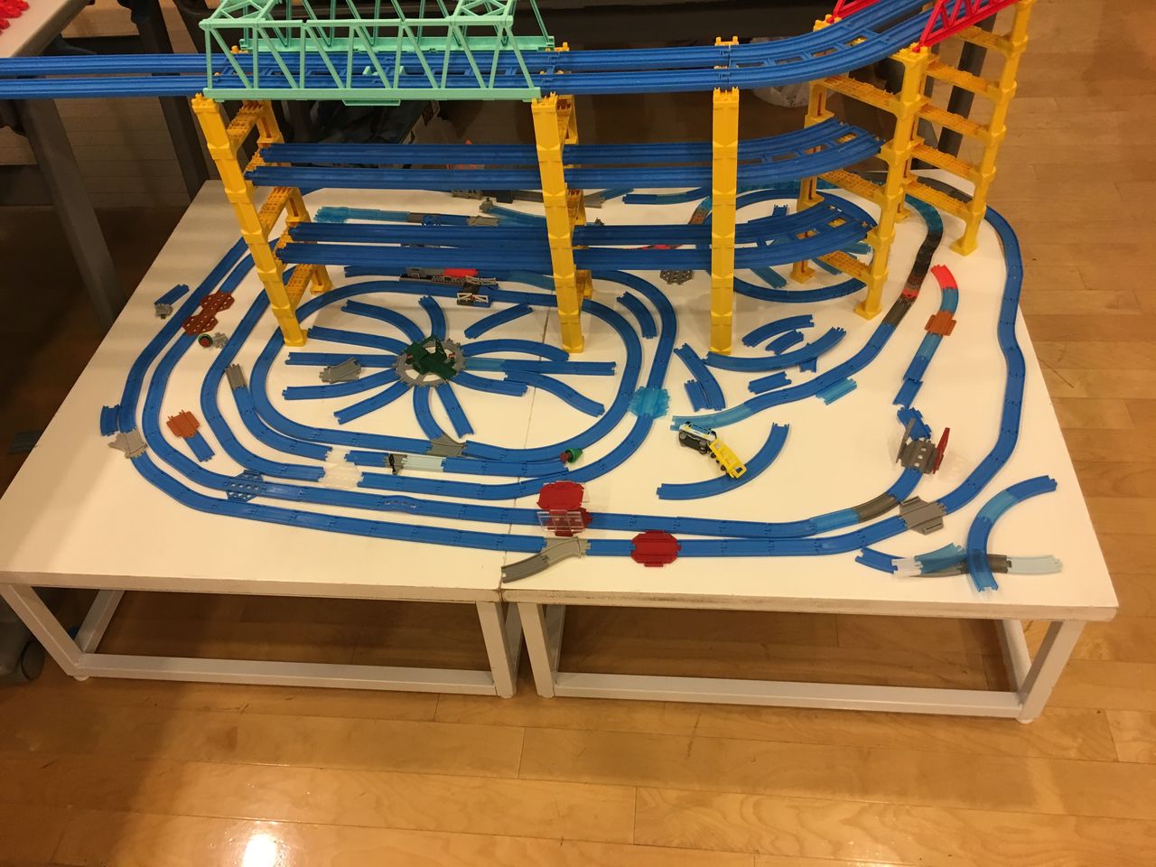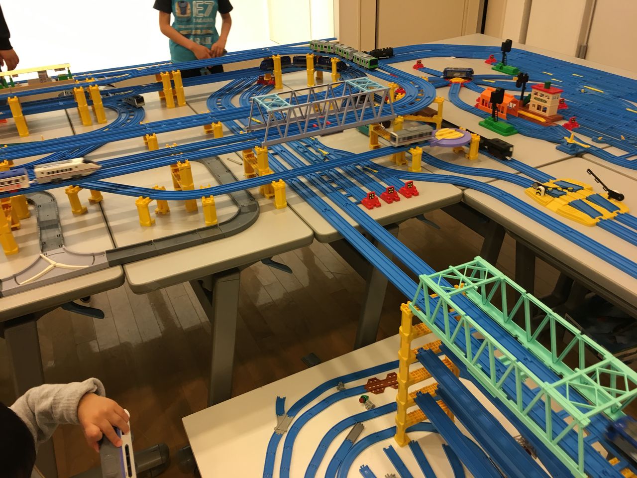 また線路の一部は机の外を飛び出し谷を渡る線路みたいになっていました。その下には橋脚を縫うように走るカプセルプラレールのレイアウトがありました。