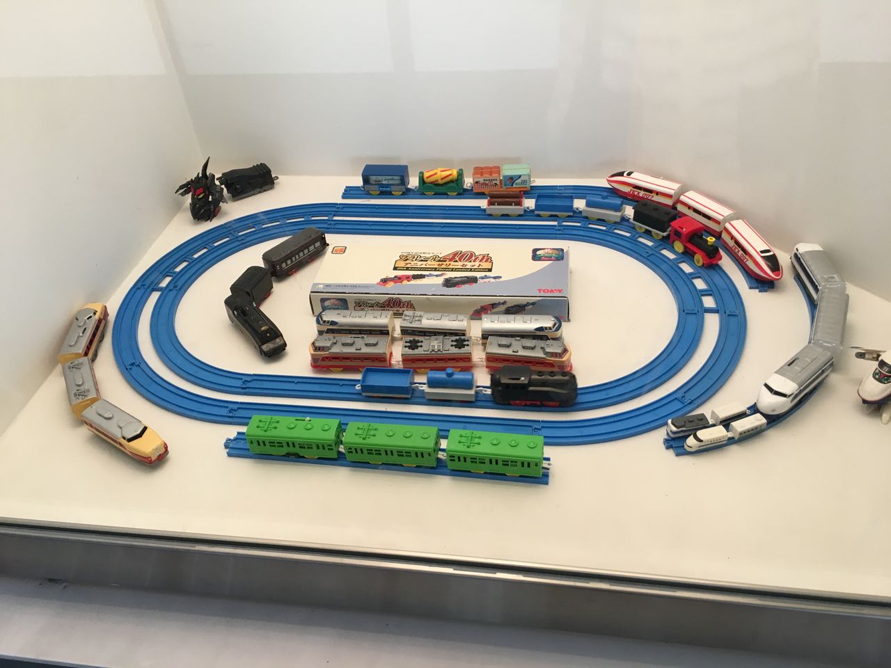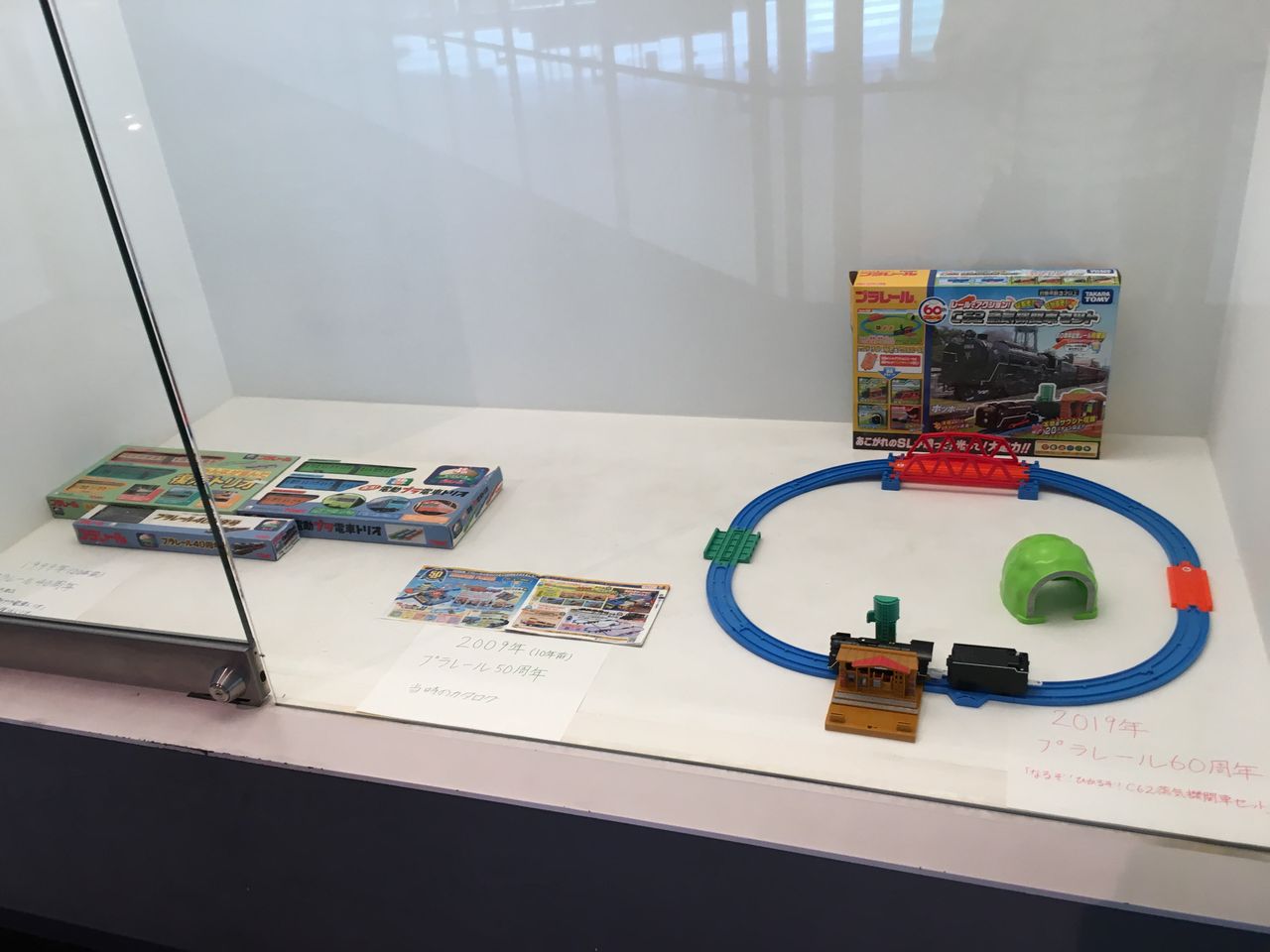 会場そばの展示ケースにはプラレールのアニバーサリーセットが。今年でプラレールが60周年だけあって40周年の記念品と60周年の記念セットが展示されていました。