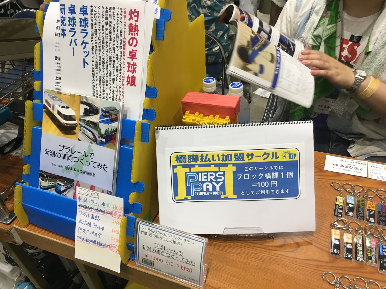 プラレールの情景部品である「橋脚」が使えるというぶっ飛びぷり。橋脚1個100円として同人誌の買い物ができます。上述の「いなかのえき」さん含めプラレールジャンルで出展しているところはこの「橋脚払い」というシステムを用いているところも多かったです。
