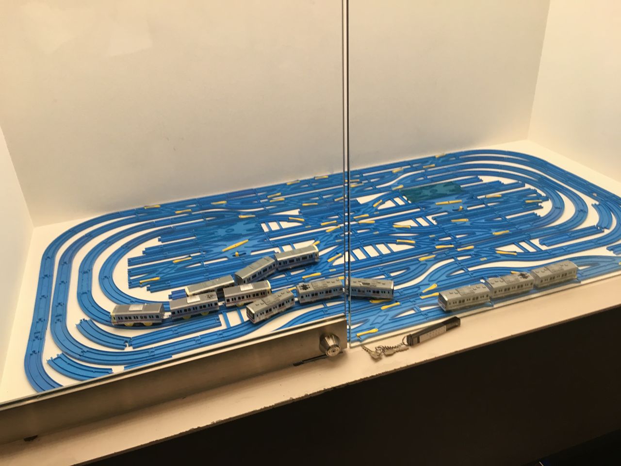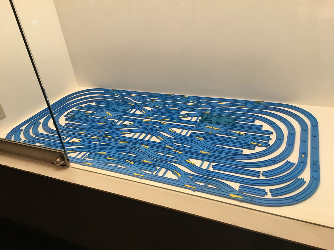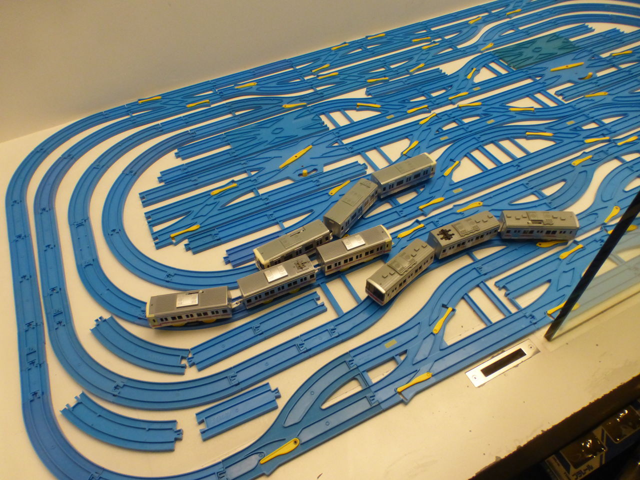 車両同士の衝突を避けるためにジョイントレールや1/4直線レールを使うなどしました。また分岐の組み方によっても車両が正面衝突を起こすため、それを防ぐためにも分岐の配置は展示中にも常に変更を重ねました。