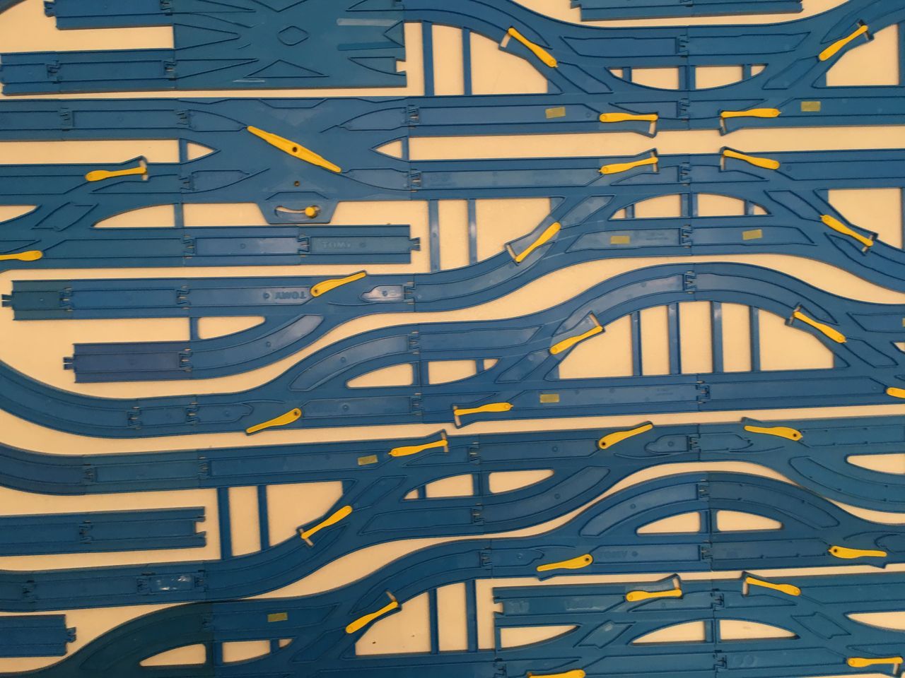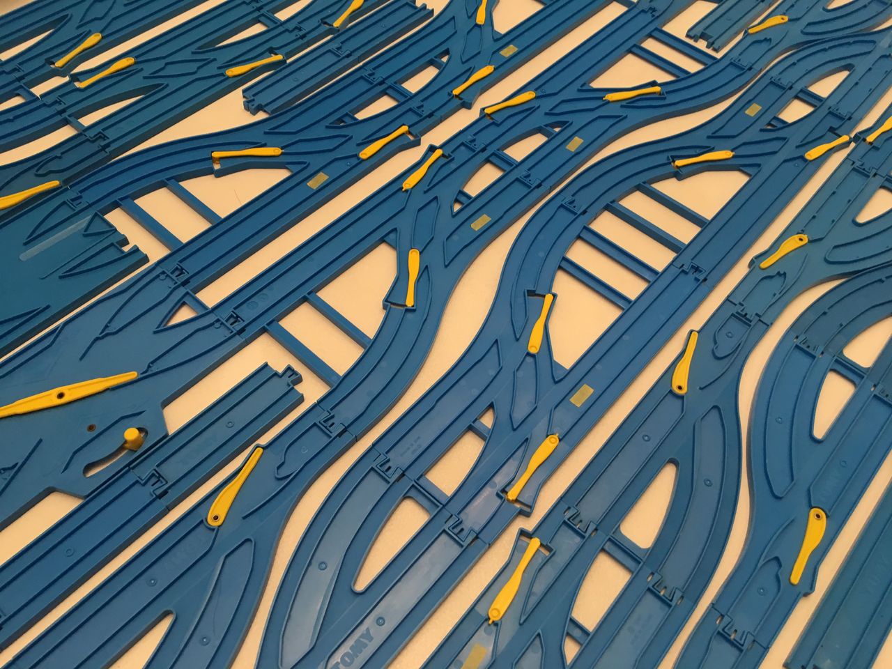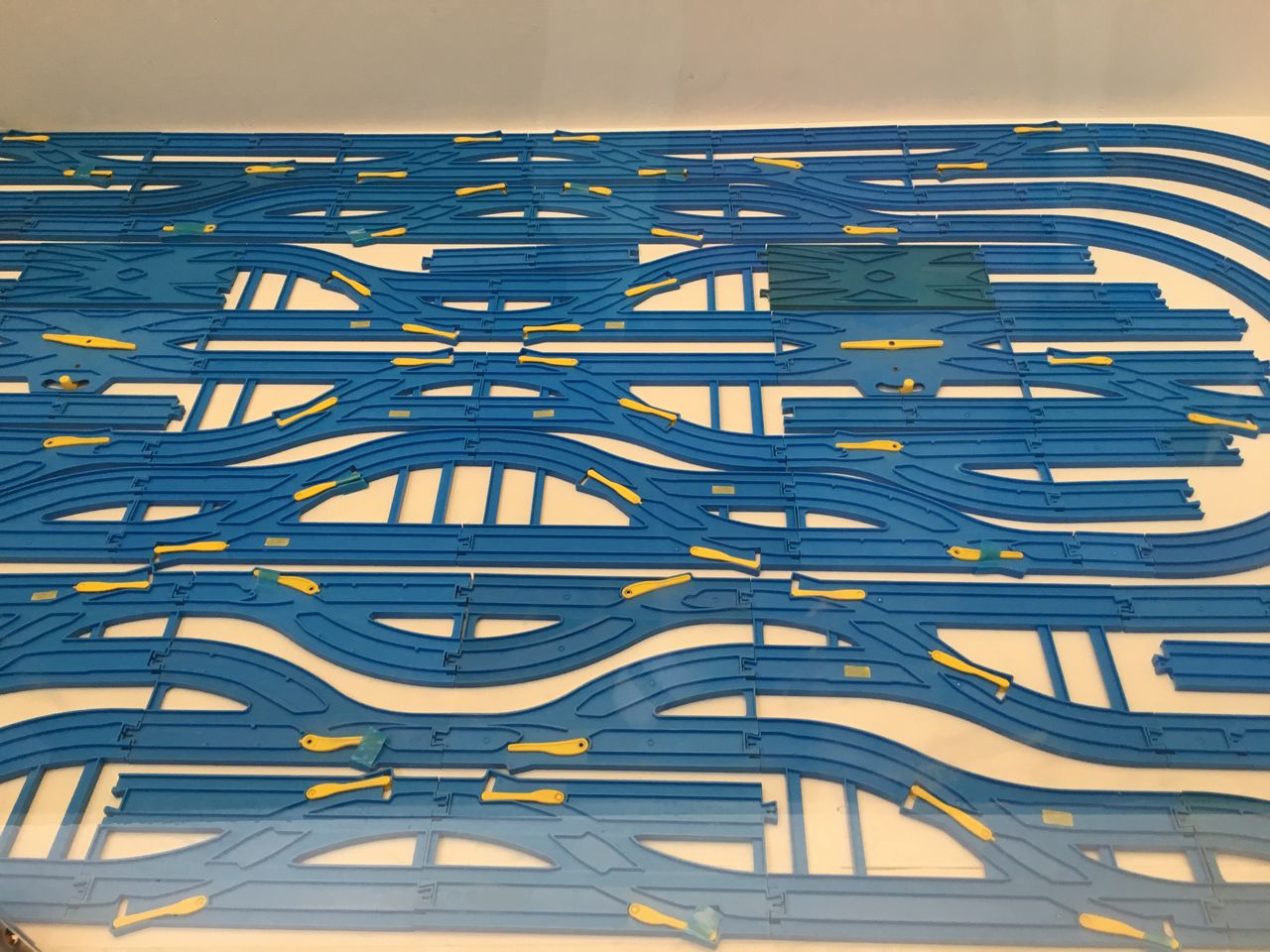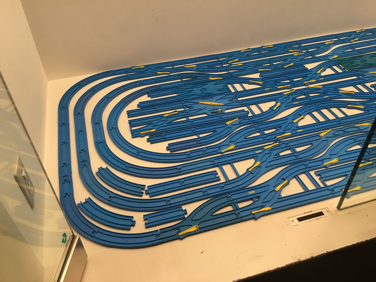 また、レールのつなぎ方として余ったスペースは曲線レールや1/4直線レールを使うなどして出来る限り埋められるよう工夫しました。これも床部分を青く染めるためです。