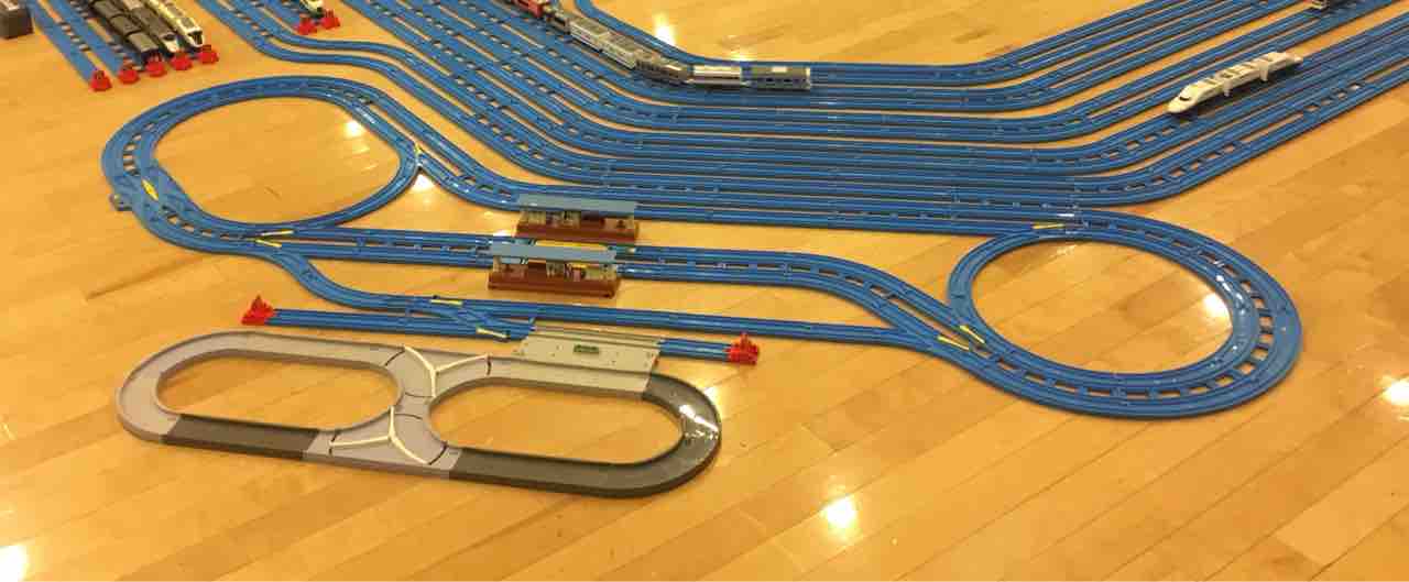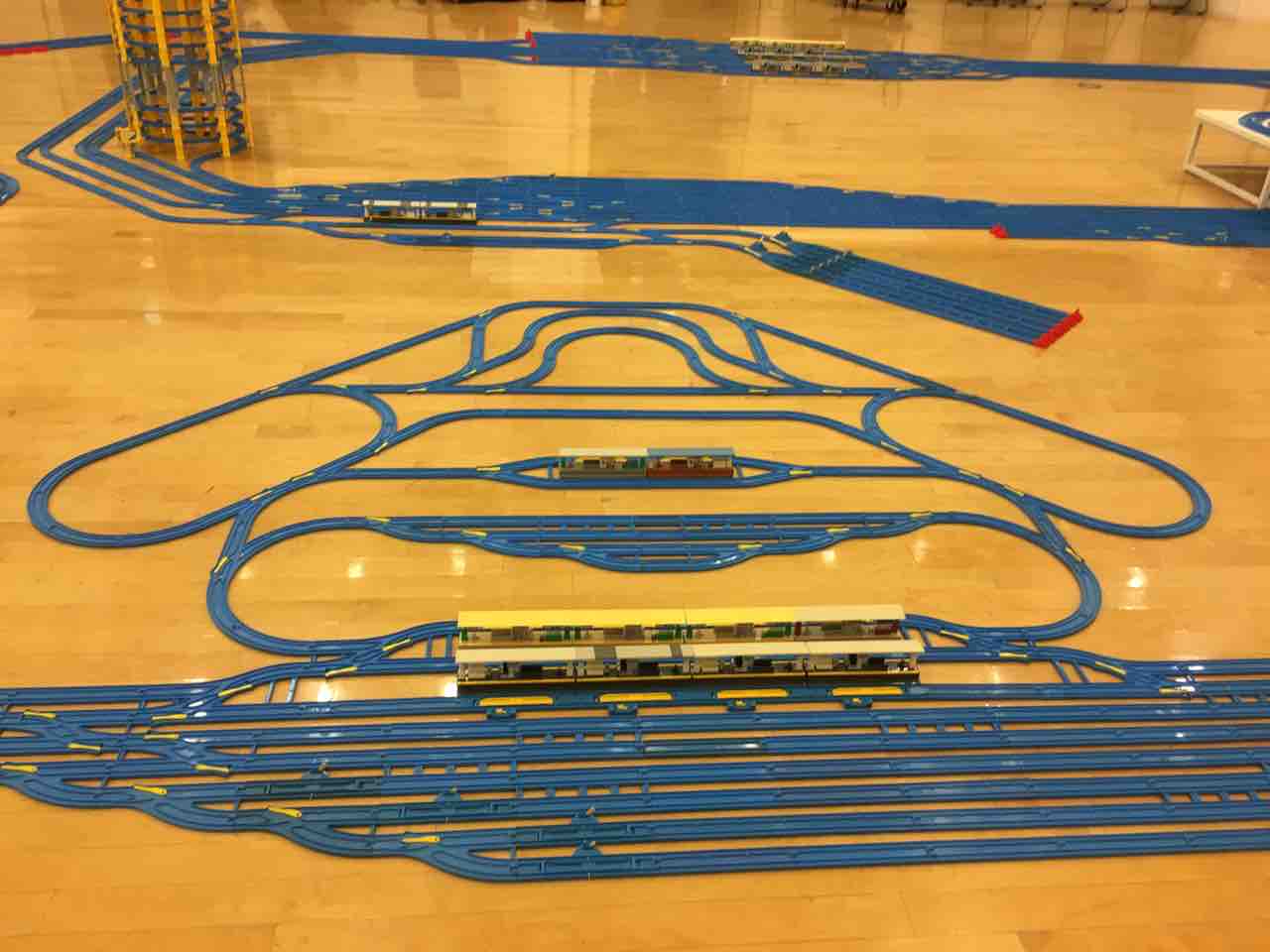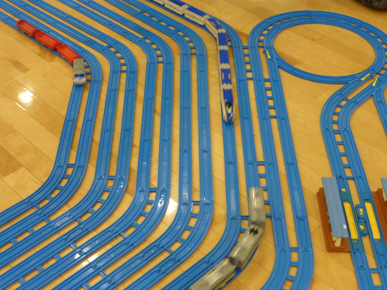 しかしこれ、ただ楕円形に線路を敷いただけではなくて、きちんと計算されて作られているんですよね。私も何度かプラフェス設営のお手伝いに行かせていただいたことがあるのですが、「向こうの直線レールが何本、こっちの直線レールが何本…」などとやっていたのを覚えています。