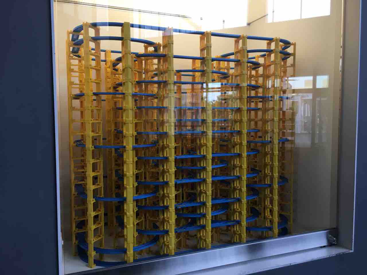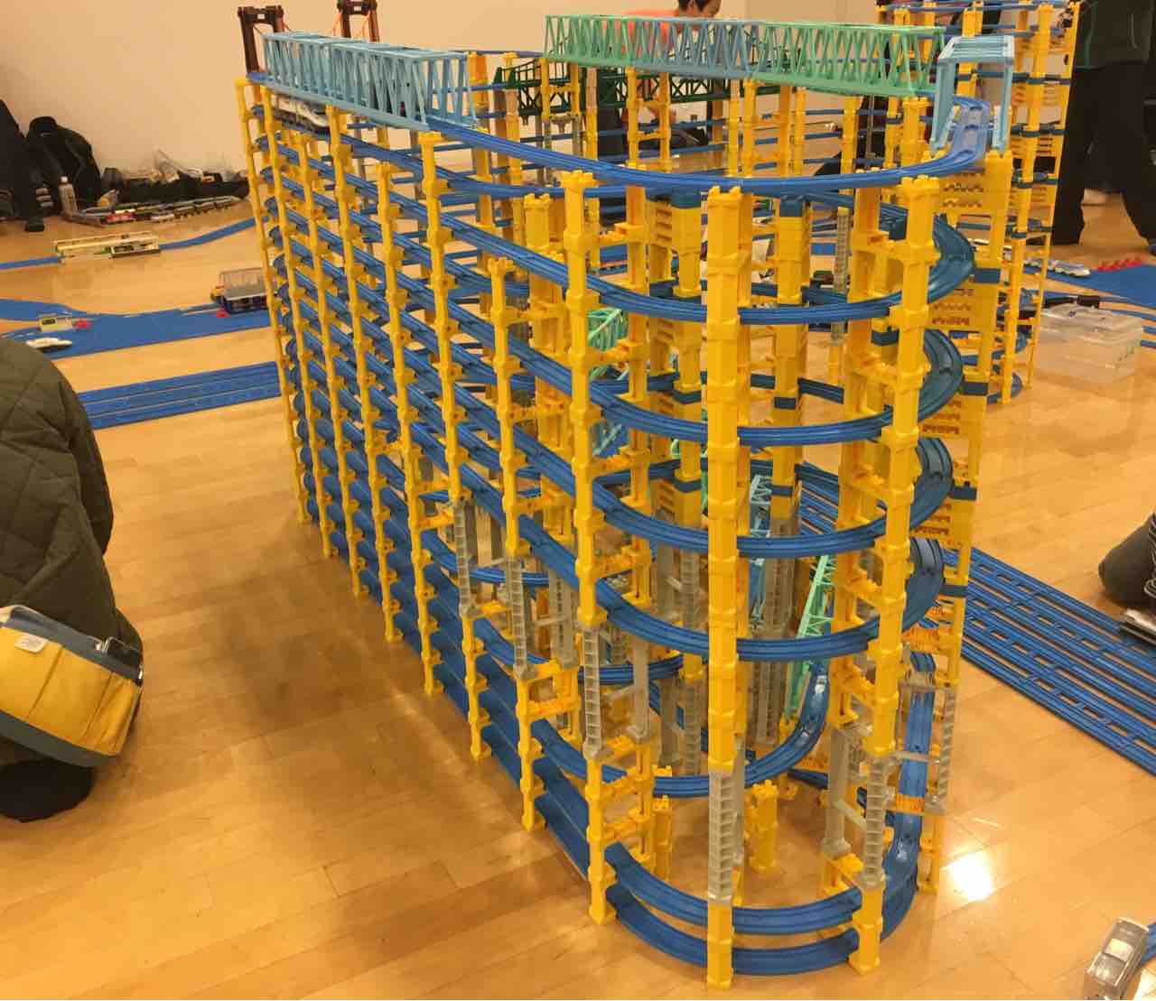 自分のやりたかった幾何学的模様をプラレールのレールで再現するをやってみたのですが、松岡さんに「やりすぎ、遊び辛い」と言われて規模を縮小してこれです。確かに今見ると遊び辛そう。