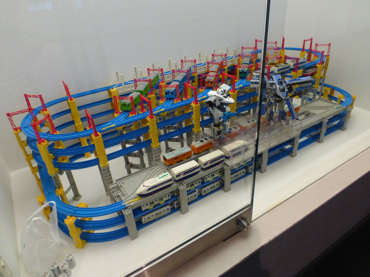 プラフェスのレイアウトは無論展示室内に設置されるのですが、プラザノースの展示室の入り口周りにはガラス張りのショーケースがあり、ここにもプラレールのレイアウトやレアもののプラレールなどが展示されています。
