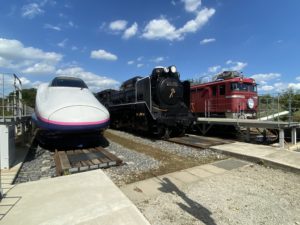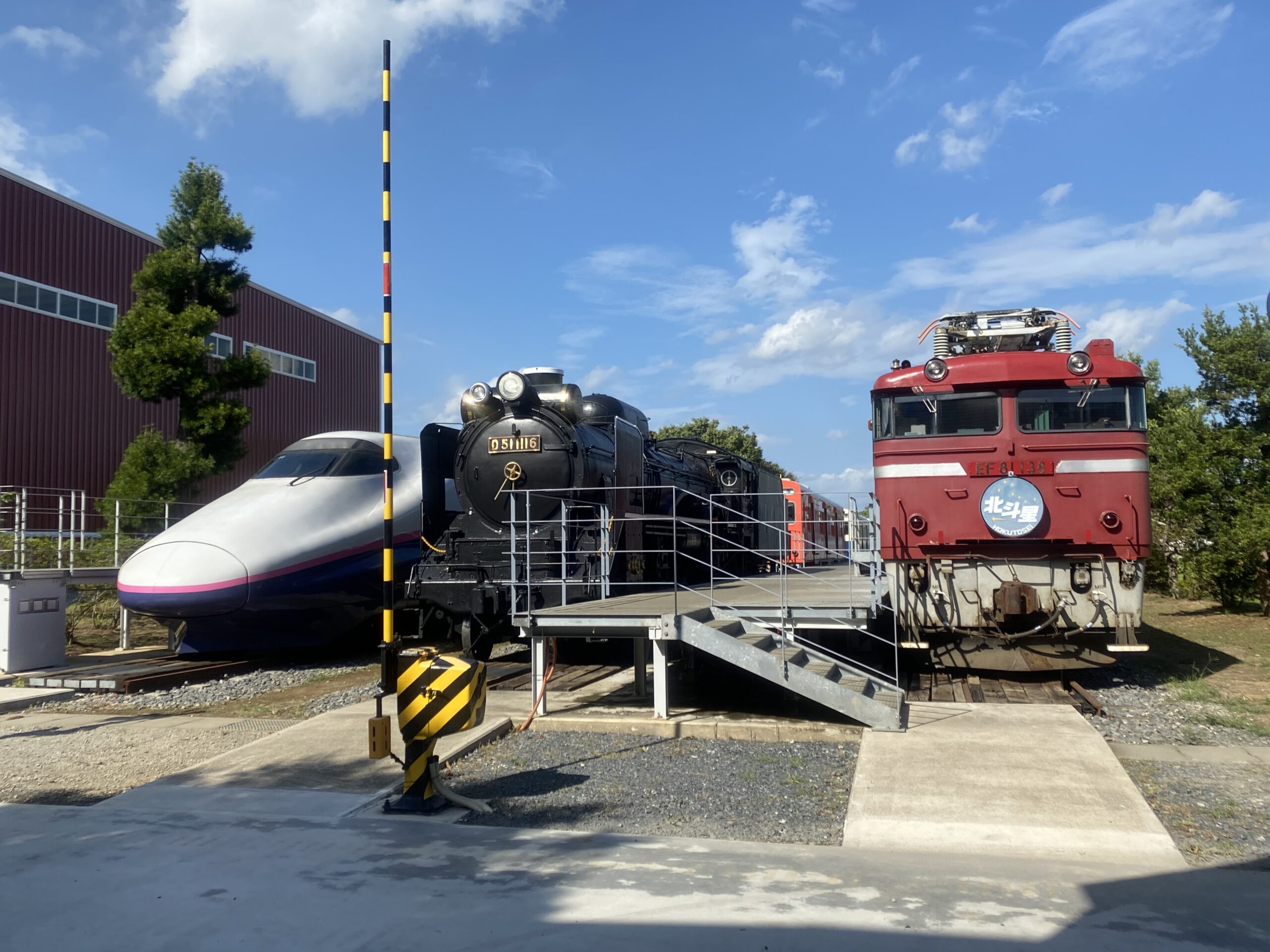 はい!こちらがE2系やD51を始めとする展示車両達です!青空の下、誇らしげに鎮座しています。