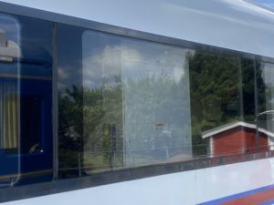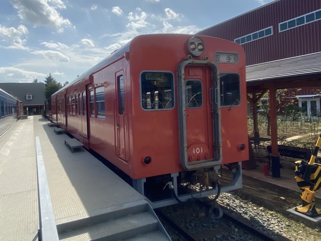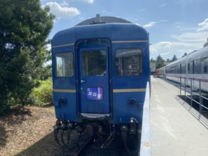 こちらの橙色の車両はキハ101という車両。車両のドアが外側に飛び出している独特の風貌が特徴的です。