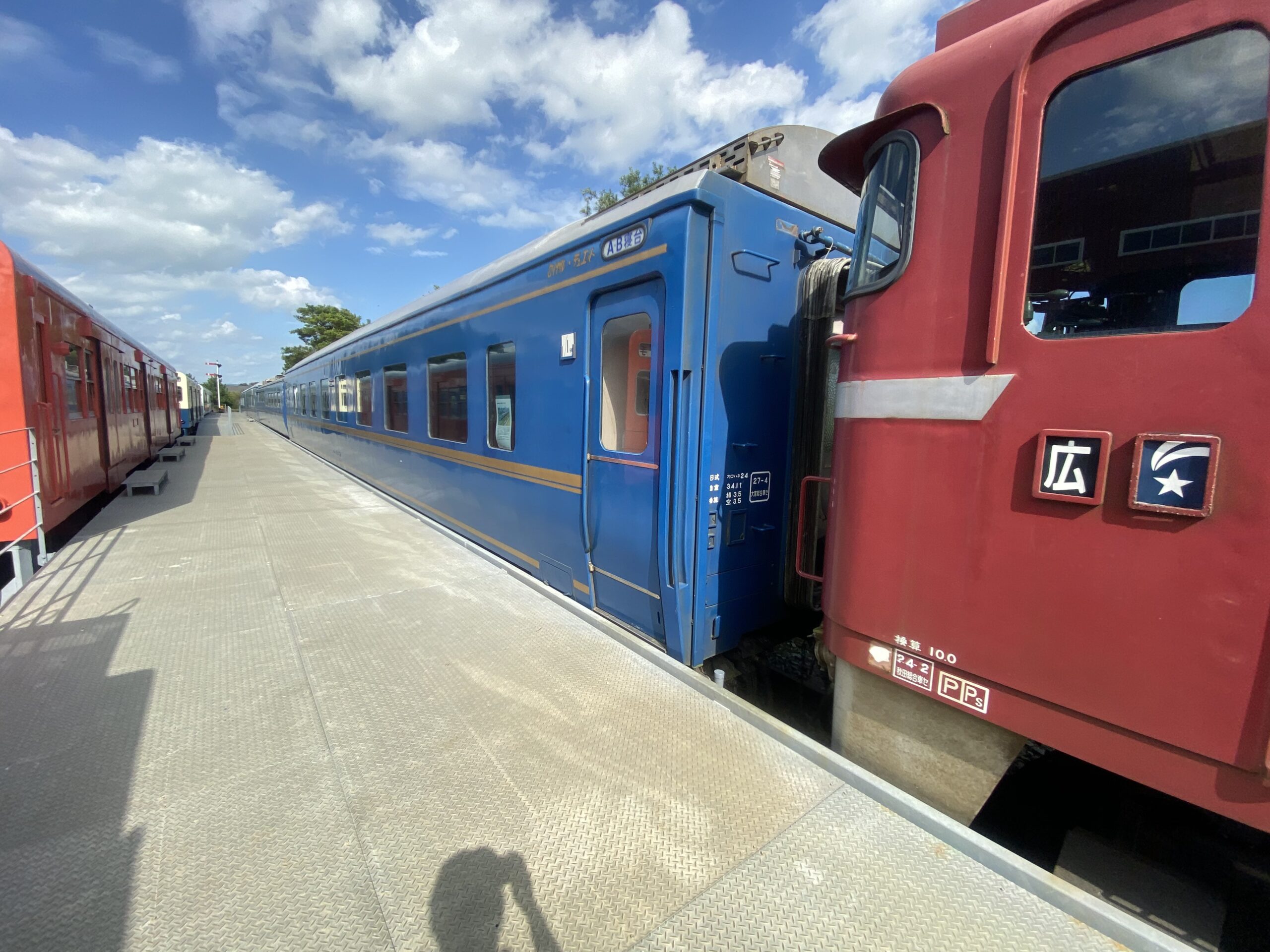 少し場所を移動してEF81の後ろを覗いてみると、ブルートレインの客車が勢ぞろい。EF81が掲げているヘッドマークと同じ「北斗星」に使われていた車両です。