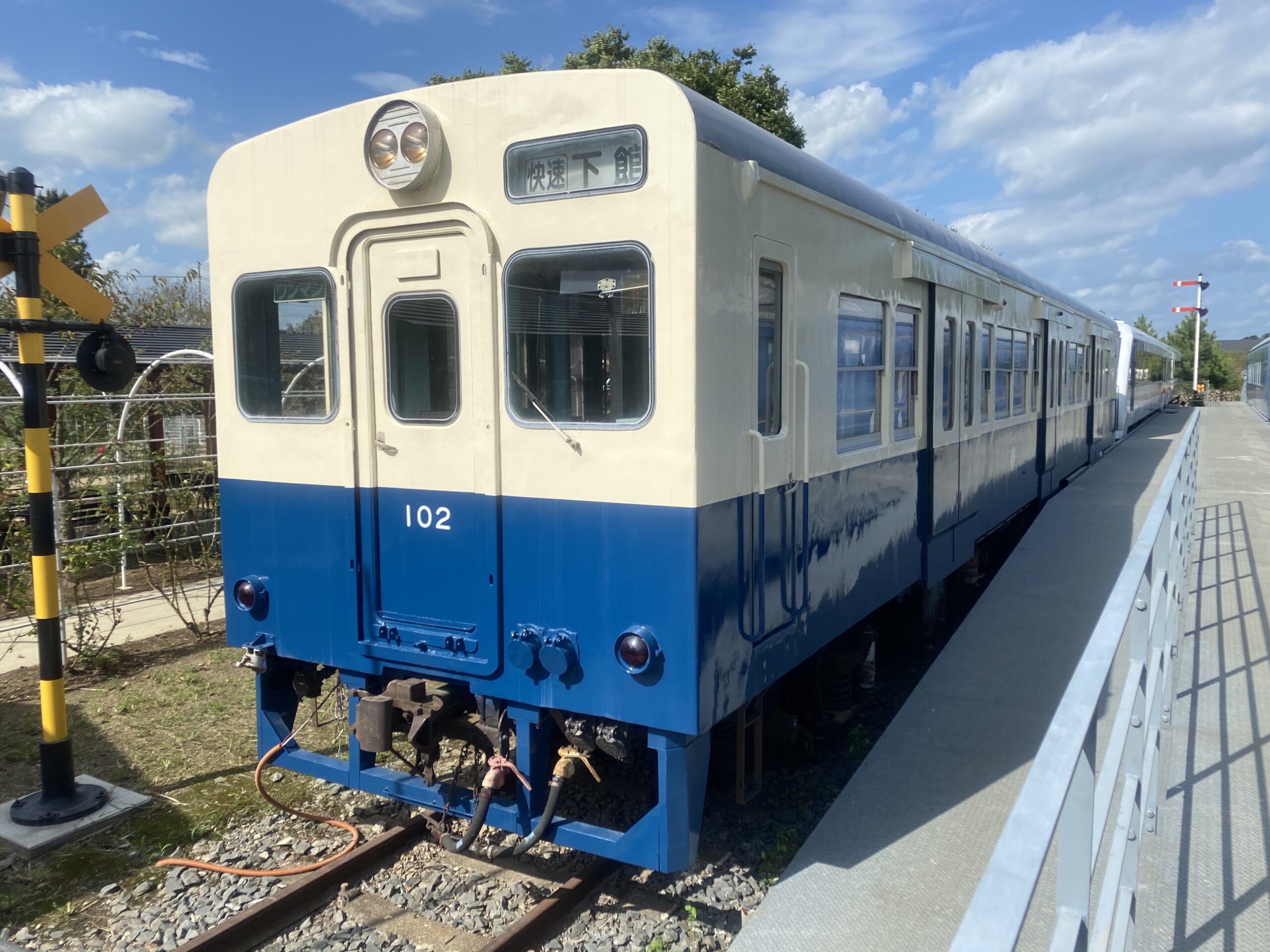 その後ろにはクリーム色と藍色のツートンカラーが特徴的なキハ102が展示されています。車体構造としてはキハ101と同じらしく、こちらも車体外側にドアが飛び出しているのが印象的です。