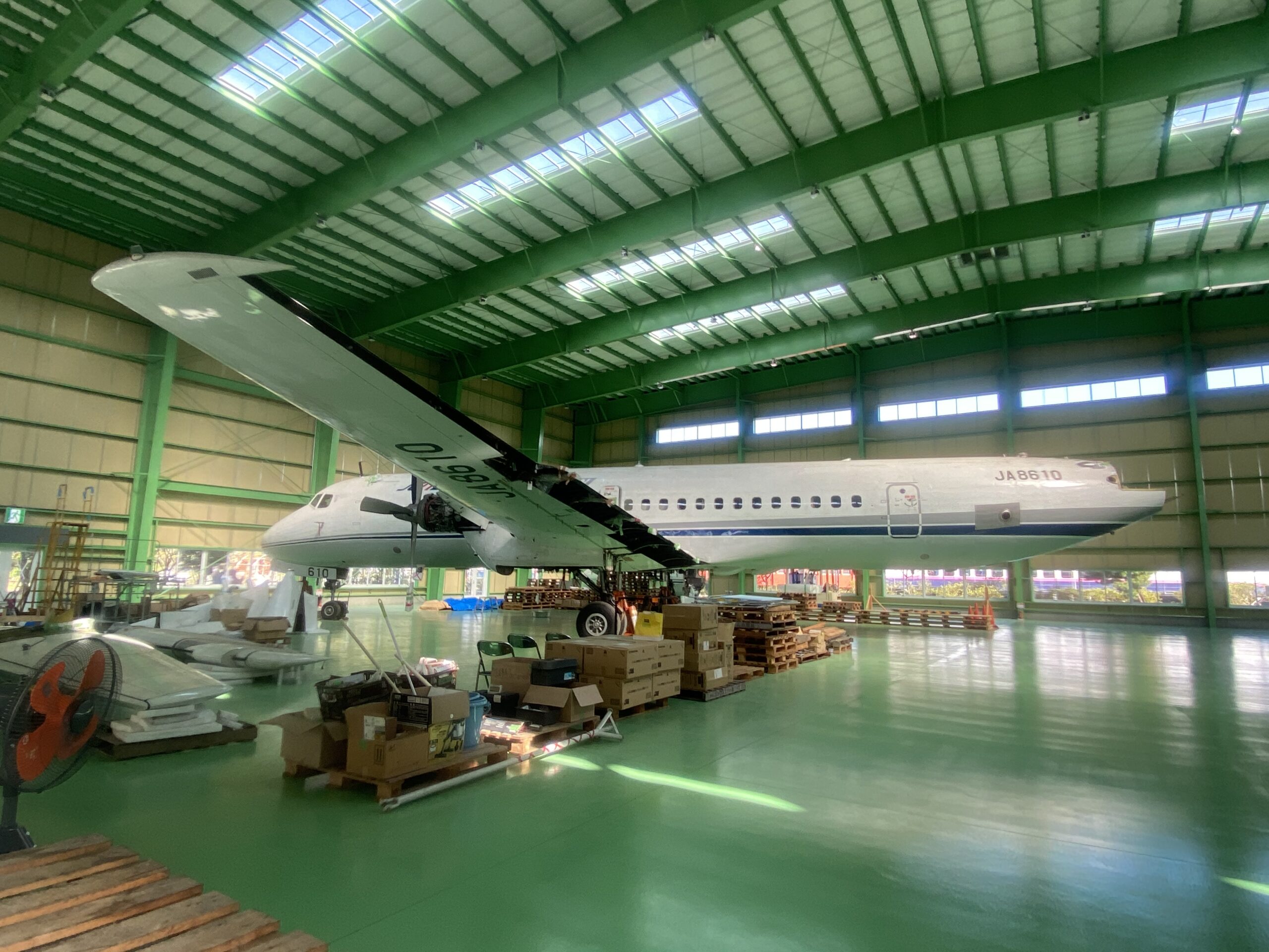 それが日本初の純国産旅客機「YS 11」です。もともとは運輸省(現国土交通省)が購入した栄えある量産第一号機で、引退後は動態保存機として羽田空港に保管されていました。やろうと思えばいつでも飛行できたそうです。