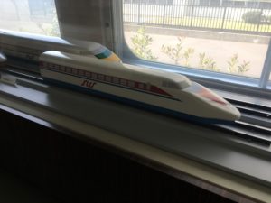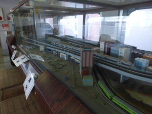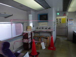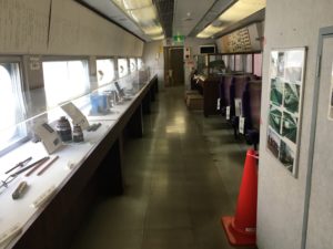 それでは運転室も見たので資料室の方に参りましょう。資料室は951形の客室部分を改装して作られています。座席類は一部を除き撤去。その代わりにビデオ台や資料の陳列棚やジオラマが置かれ、951形を始めとする新幹線の歴史的な資料を展示sて言います。