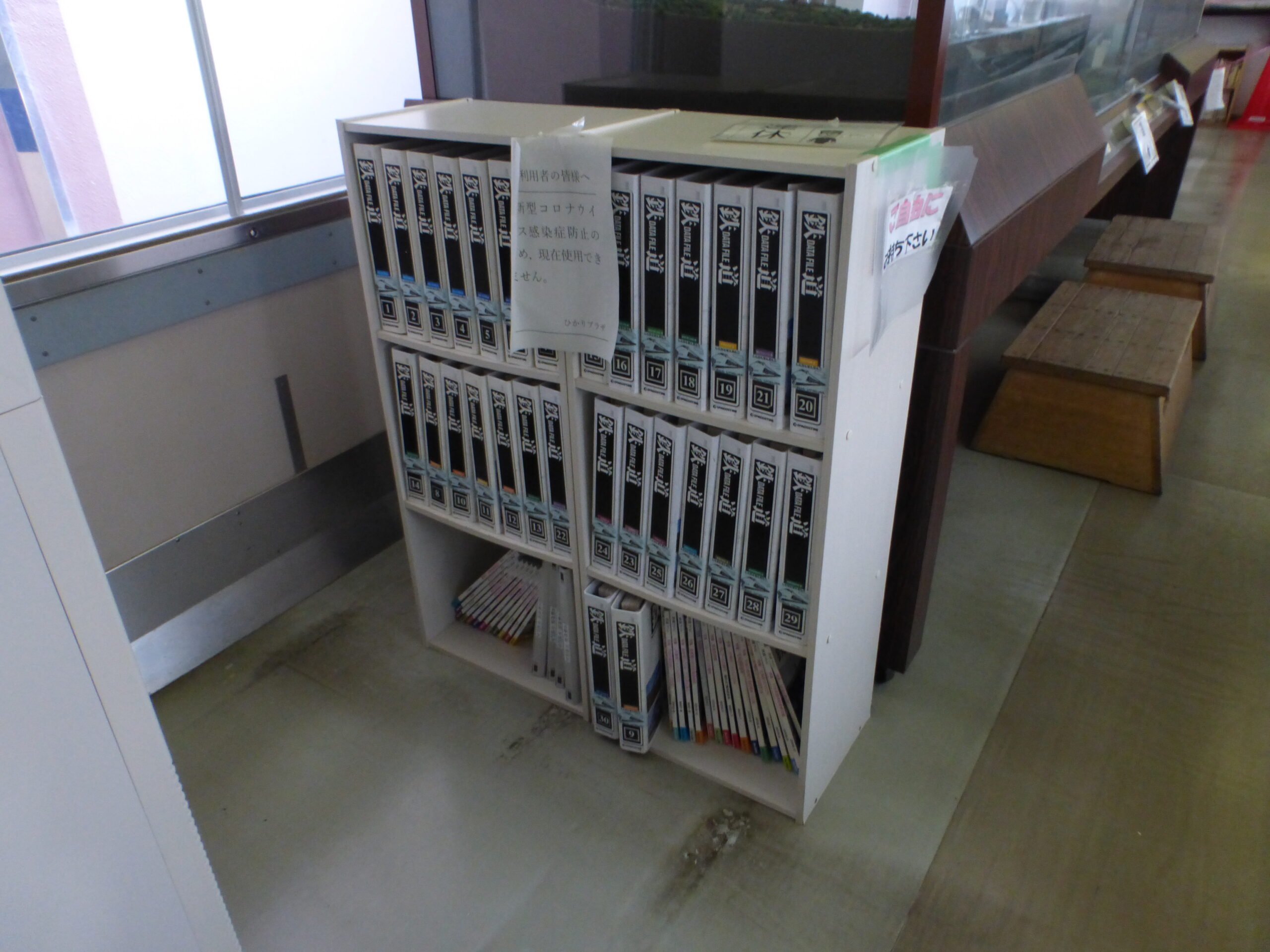 他には雑誌類などが集められており、棚に並べられていました。ですが、これもコロナ云々で触れず…。どんな資料が置いてあったのですかね。読んでみたかったです。