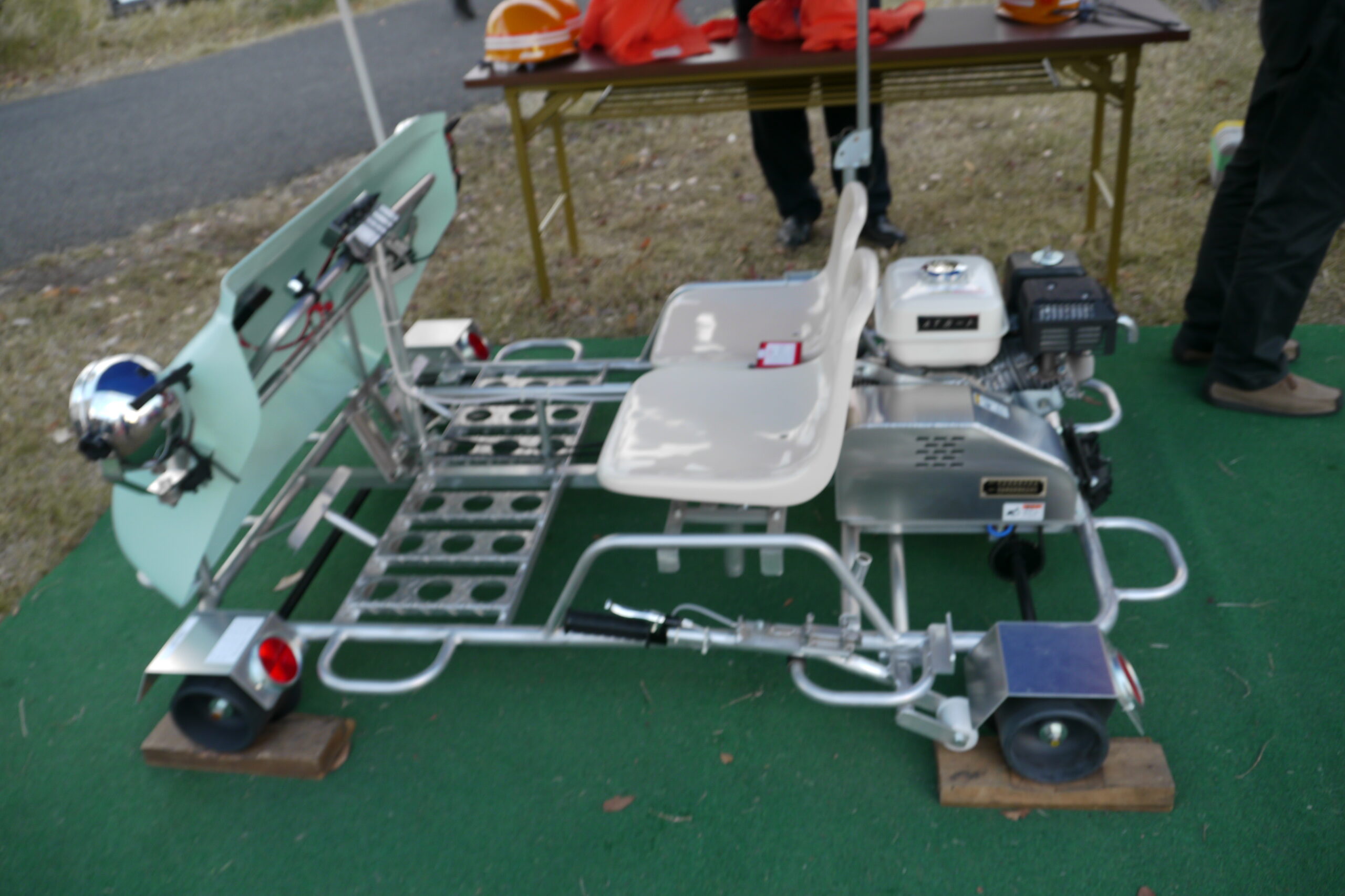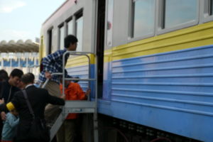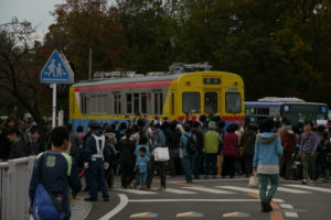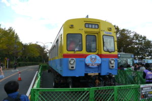 とすると駅構内や車両基地で行われたイベントではありません。競技場脇の広場で開催されたイベントです。そのため、鉄輪台車を履いた状態では会場まで来ることが出来ません。