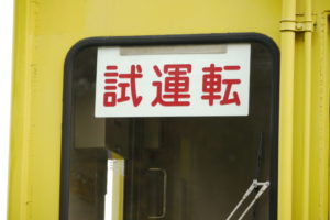 中間車側の改造先頭車には、サボで「試運転」の表記が。こちらは運転台に改造されてから営業運転に就くこともなかったですし、簡単にサボで済ませちゃえ、ということなのでしょう。