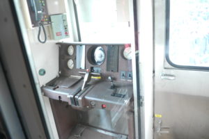 運転台の様子。おそらくこれは食パンの方の運転台でしょう。全面のサボが“回送”or“試運転”で裏返して表示されるようになっており、まさに事業用車の様相を醸し出したいます。
