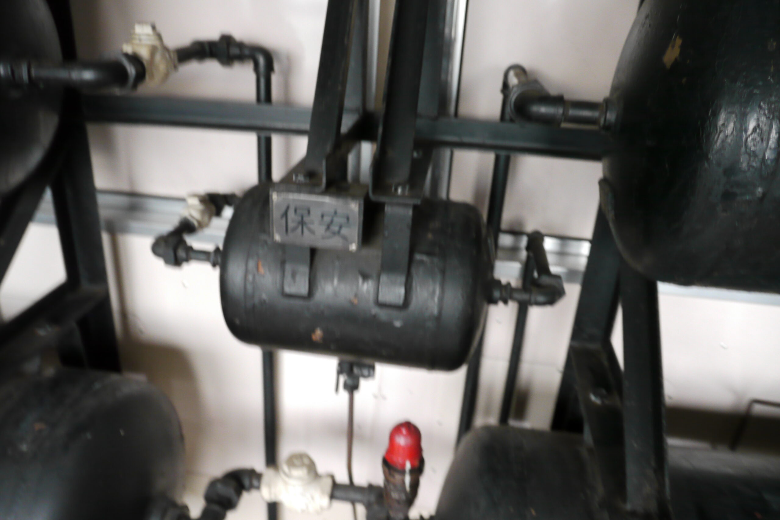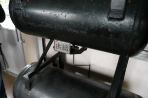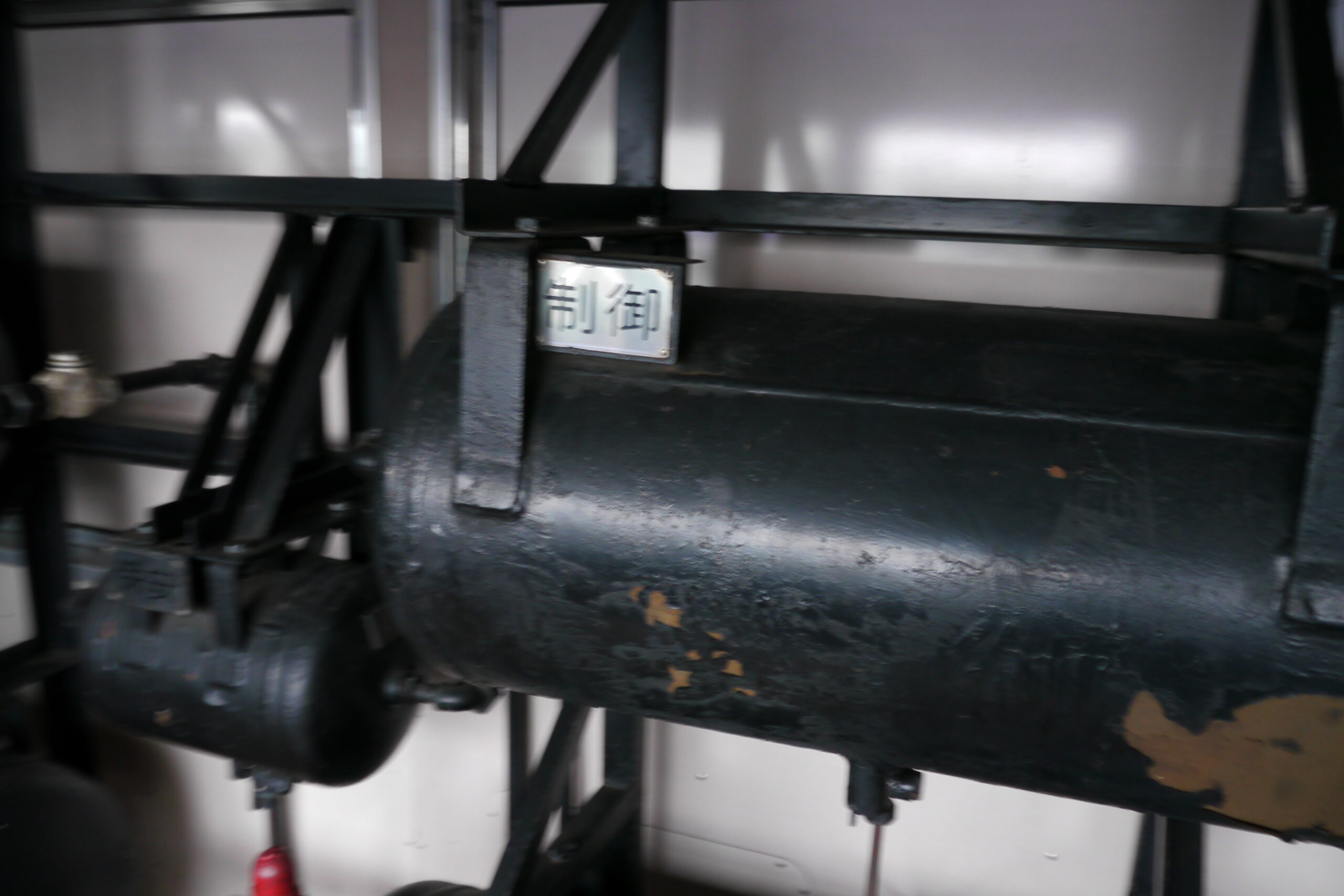 一気に行きます。こちらは“保安”や“供給”などと書かれた空気タンク。おそらくは他の車両と連結するときにこの空気弁を介してブレーキの連動を測っていたのでしょう。4枚目の写真の“7700”や“9000”の文字からもそれが読み取れます。
