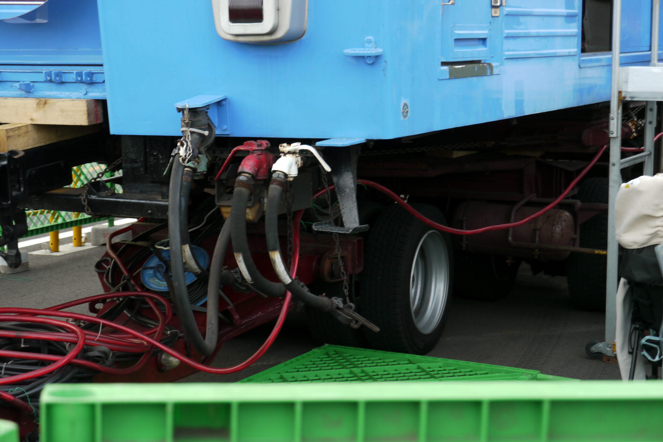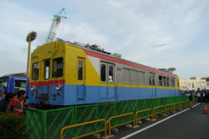 そこでデヤ7200は運ばれる時に道路用の台車を履いて会場まで来ました。そのため、絵的には少し面白い状態に。陸上輸送用の台車を履いている電車を見れるのもこれまた珍しいですね。