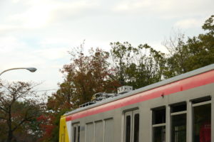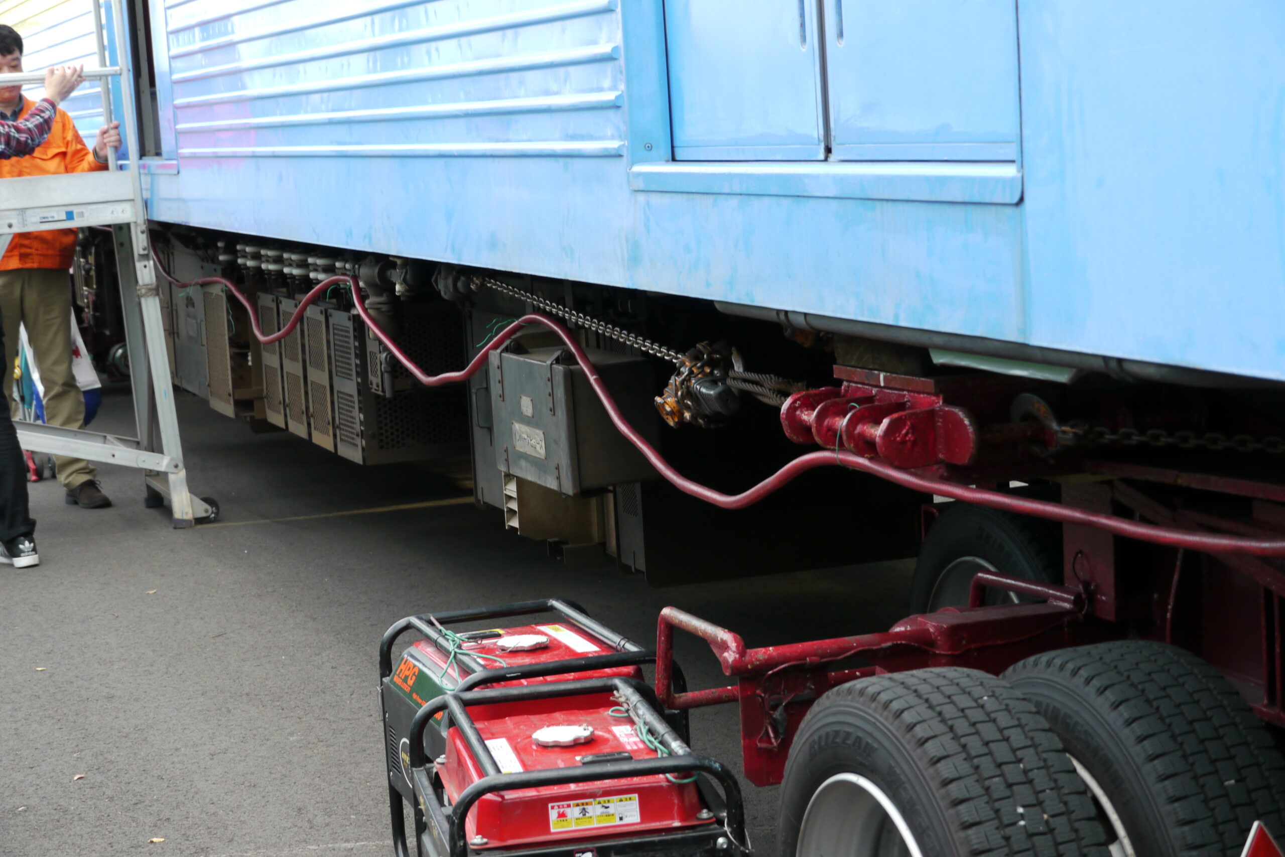 地面から電車を見るので床下機器も良く見えます。そばに見える発電機のようなものは何でしょうか?搬送用タイヤの充電器でしょうか?