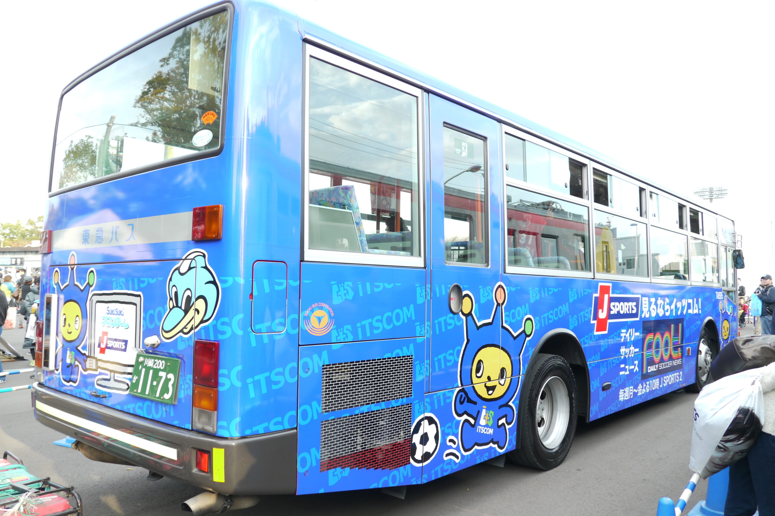 デヤ7200の隣には東急バスの特別塗装車が。これは東急系列の川崎フロンターレとイッツコムのコラボ塗装バスですね。青い車体も目立ちますが、その中に溶け込む“ITSCOM”の文字が中々狂気。思いっきり広告してますね。