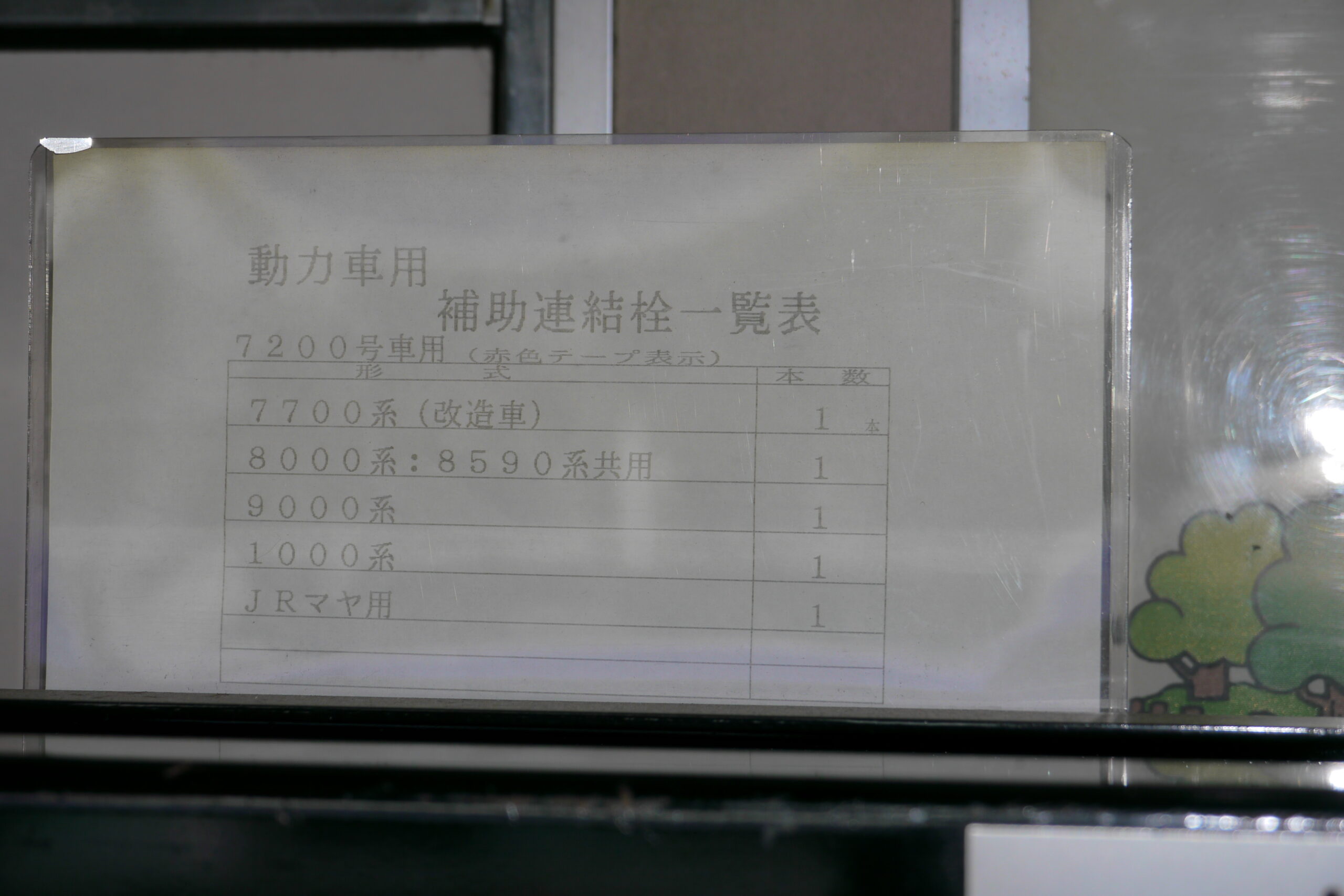 回送サボ下の注意書き。デヤ7200は基地内で検査をする車両の牽引をしていた車両でもあるので、連結相手がコロコロ変わっていました。それに関する注意書きですね。「7915Fと1000系は除く」ってなんだろう…。貫通ドアの有無かな?