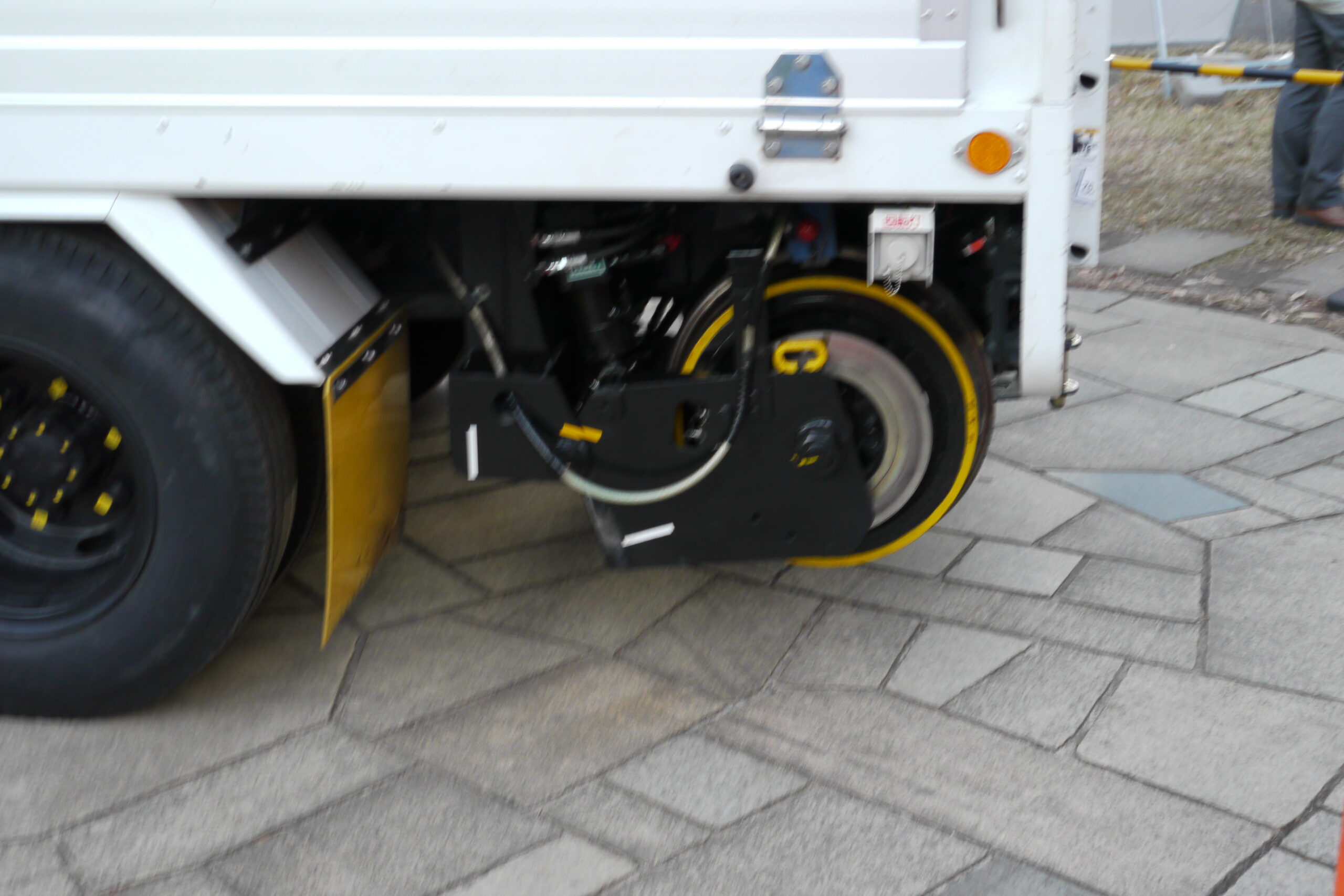 このタイヤの後ろについているのが軌道用鉄輪。軌道走行モードではこの車輪を下ろして線路の上を走ります。