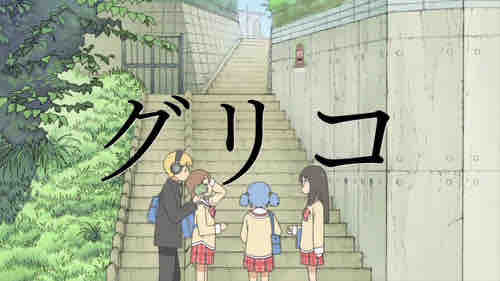 유코 일행이 「가위바위보 글리코」 놀이를 하던 계단. 사진 오른쪽 계단이 애니메이션에 등장한다. 왼쪽 계단은 아파트로 연결되는 사유지 계단이므로 올라가지 않도록 주의.